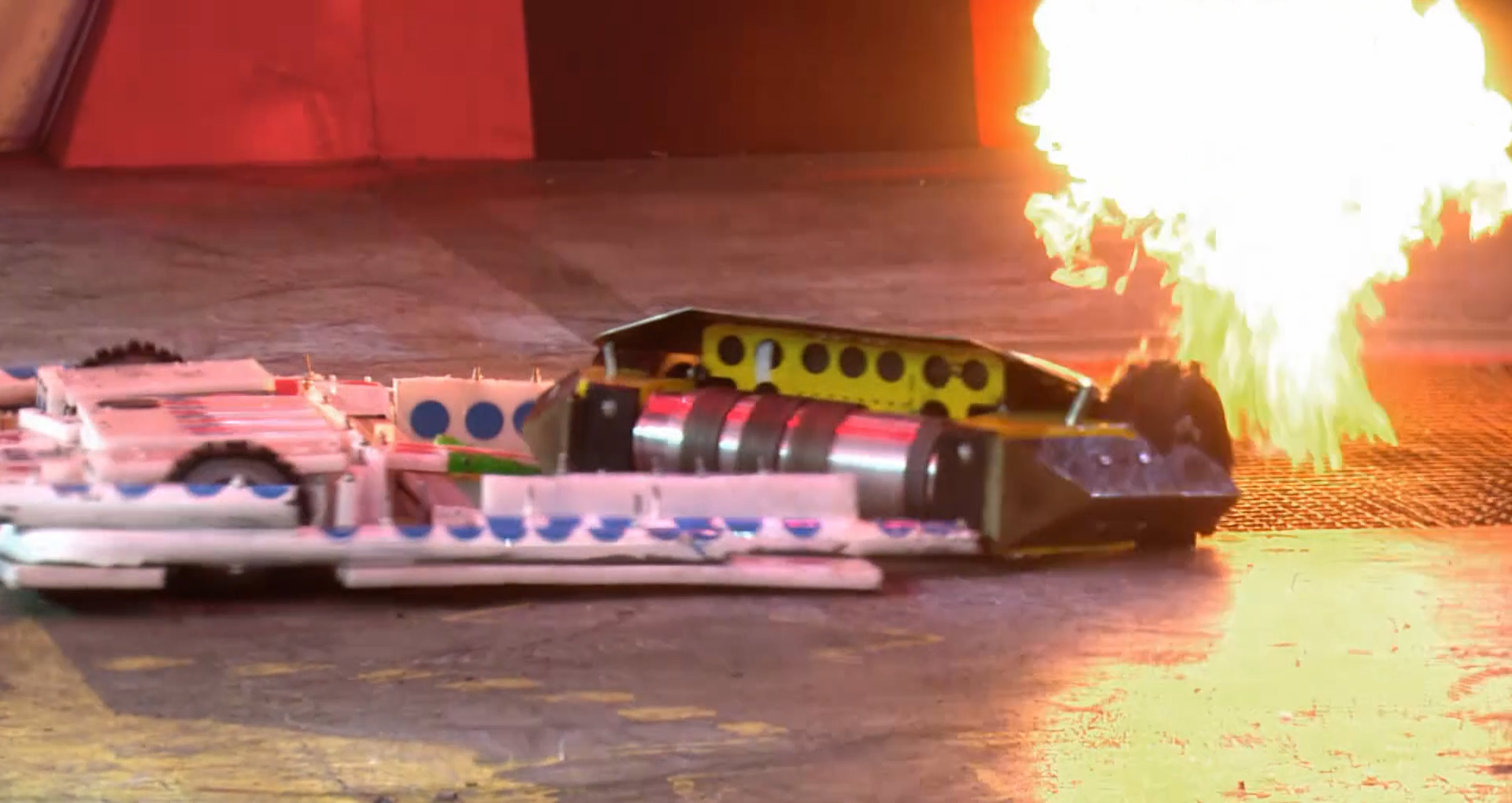 Jellyfish momentarily launched Sabretooth off its wheels as the latter drove up one of its sides, before steering it towards Sir Killalot's CPZ. Sabretooth escaped by driving over Jellyfish's top, with Jellyfish again pursuing Sabretooth as it got caught on the Pit panel. After a brief hesitation, Jellyfish clamped Sabretooth again, spinning it around in circles and steering it close to the Flame Pit.