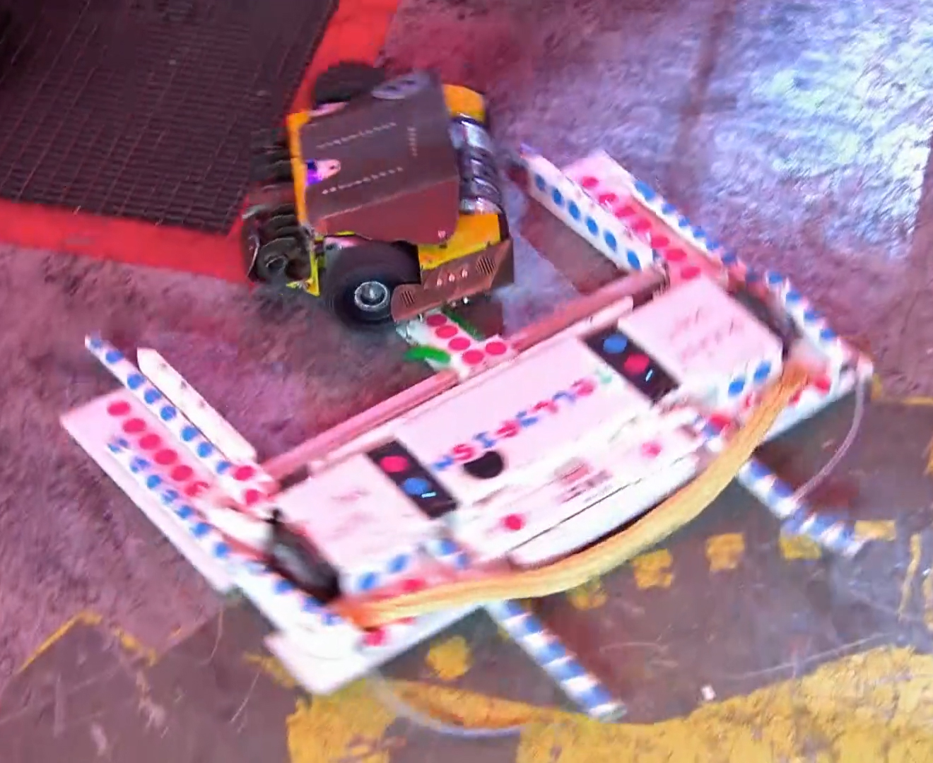 Again, Rapid got underneath and pushed Jellyfish around the arena and into Terrorhurtz, before flipping it again. Jellyfish withstood an axe blow from Terrorhurtz as it escaped the empty CPZ, before attacking two of Nuts 2's minibots. It was then pushed into another CPZ and flipped over by Rapid once again, losing an eye and being left unable to freely drive inverted. After some time, Jellyfish was counted out, and initially eliminated alongside Nuts 2.