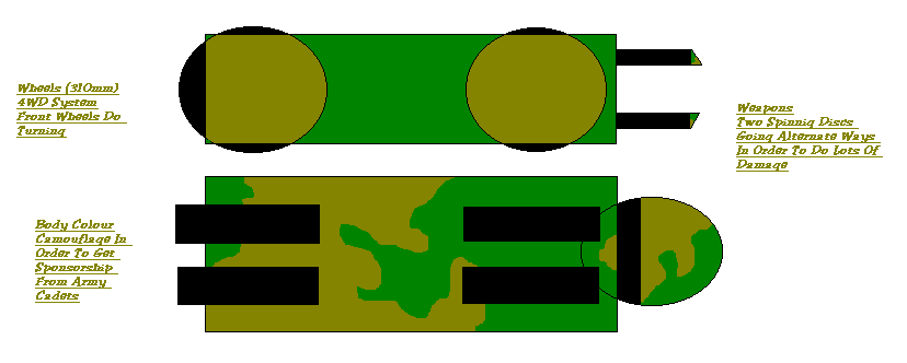 At the front of the robot, two horizontally mounted discs would spin in opposite directions to cause damage to opponents, and the entire robot was given a camouflage paint job in an attempt to receive sponsorship from the Army Cadets.[2]
