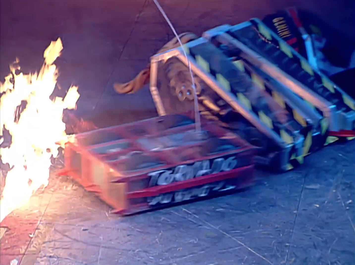 Shortly afterwards it was righted by Tornado, but the lifting arm was jammed and the robot was completely immobile. Tornado was later pitted, and the Kater Killer team began to celebrate, but by then it was too late for Kater Killer, as it had been immobile for too long.