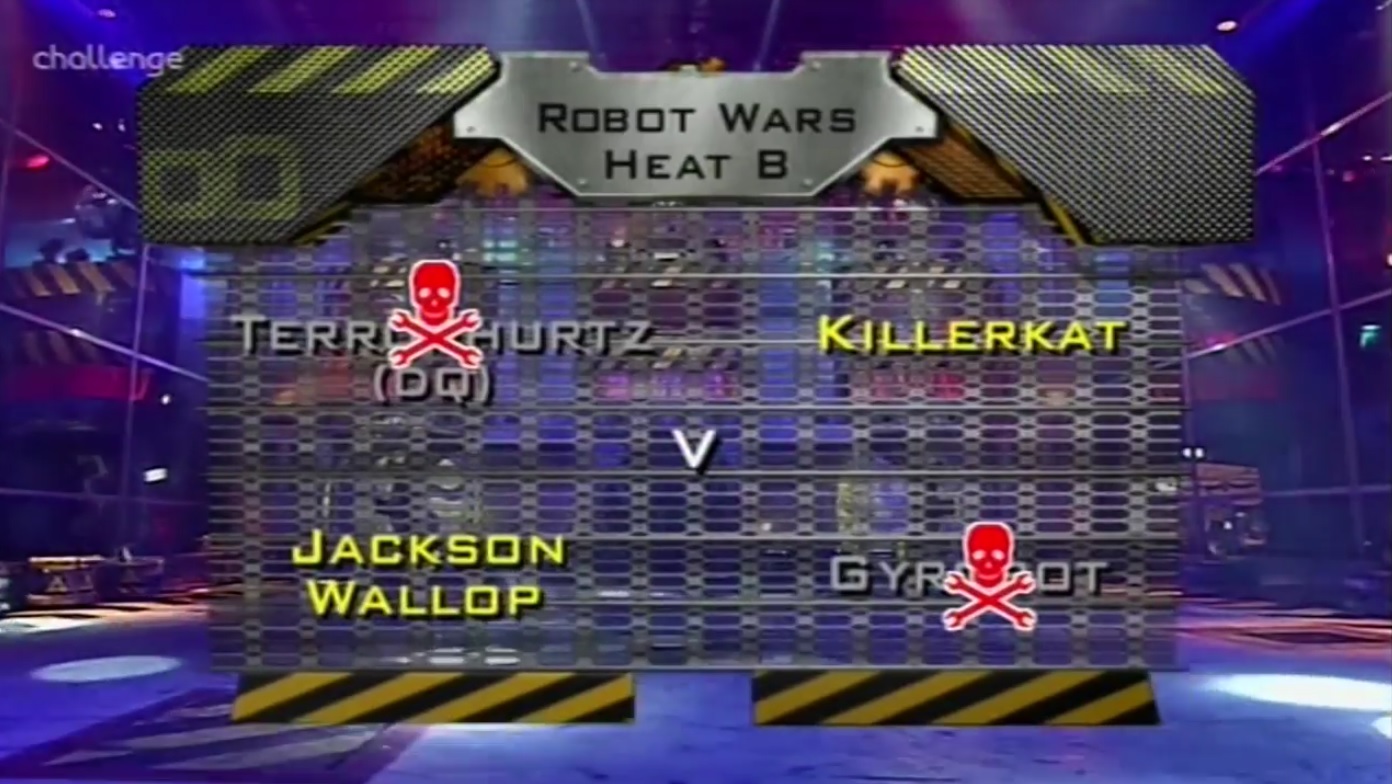 Killerkat competed in Heat B, and was due to compete alongside Gyrobot, Jackson Wallop and the third seed Terrorhurtz in its first round battle. However, Terrorhurtz's disqualification for arriving at the studio unfinished[2] saw the three remaining robots fight alone.