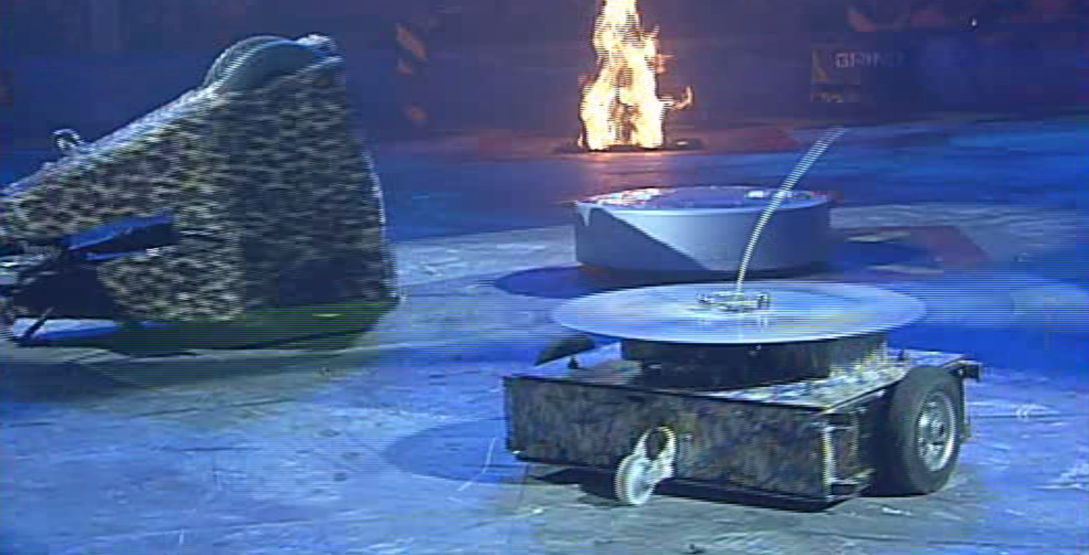 - — Jonathan Pearce as Gyrobot pushes Killerkat onto the Flame Pit