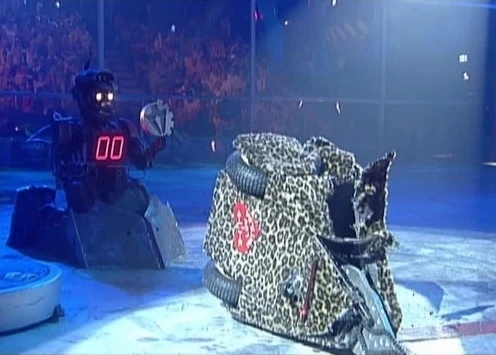 Killerkat was then pushed onto the Flame Pit by Gyrobot during the countdown, where its leopard fur was set alight. The smouldering Killerkat received more damage from Jackson Wallop before Shunt pushed it onto the Floor Flipper, where it was tossed a considerable distance across the arena and landed on its back. 'Cease' was called, and Killerkat was eliminated from the Seventh Wars.