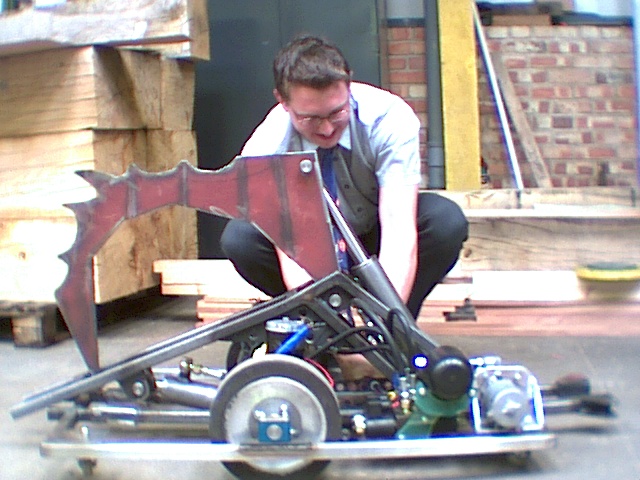 By summer 2001, King Ludd had entered a relatively advanced stage of construction, with details and images of its design being shared on two versions of the team's website.[2][3] Driven by two aluminium wheels with solid 10-inch rubber tyres,[4] it featured a welded frame and was to be armed with two hydraulically-powered weapons - a lifter, and a large spiked crushing claw.[5] Originally, the hydraulics were to be operated by a pump sourced from a lifting platform, though weight restrictions forced The Luddites to obtain a lighter closed-circuit system that lacked a reservoir.[4] Though not much is known about the remainder of King Ludd's drive system, the team credited the unknown owner of a local wheelchair shop, suggesting that it utilised components from these.[6]