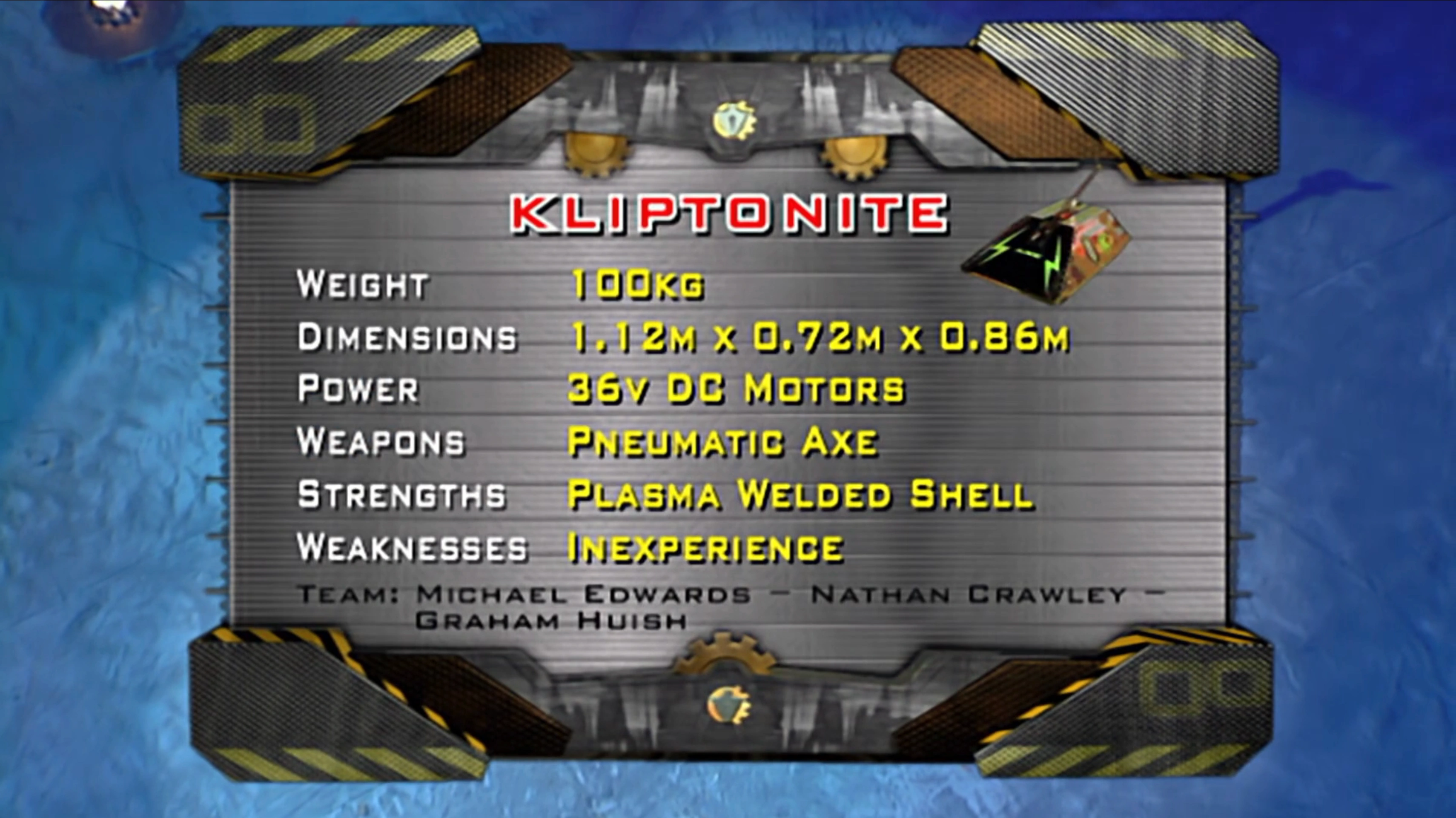 - "A stainless steel plasma-welded shell, powerful motors, an axe/lifter, 15 miles an hour top speed. Lack of experience, but can Kliptonite bring down our own "Super-Bots"?"