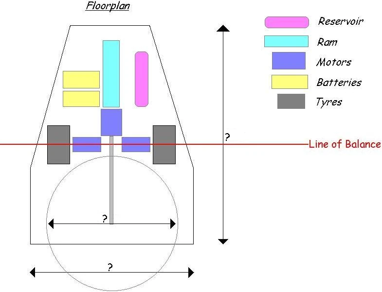 The robot was powered by two Bosch motors driving a pair of sturdy go-kart wheels. Its rear-mounted spinning disc was made from steel, weighing 19kg and measuring 430mm in diameter, according to the team.[2] Kruel Intent also featured a front-hinged pneumatic ram which would double up as a self-righting mechanism, inspiration also taken from Rex Garrod's machine.