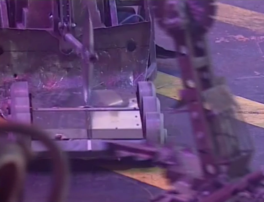 Lateral Thought drove back and forth in the opening seconds, but soon found itself in the PPZ, where it had its top panel axed by Shunt and was caught under Dead Metal's pincers as it tried to escape. Both House Robots continued attacking Lateral Thought as it sat immobile, with Shunt axing and shoving it into the Pit. This eliminated Lateral Thought early on from the Reserve Rumble, which was eventually won by Jim Struts.