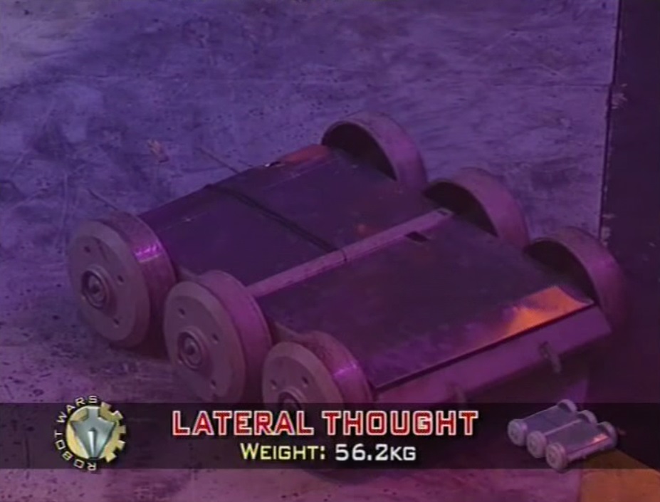 Lateral Thought was an invertible, six-wheeled robot armed with a set of spikes. It was box-shaped, and had a ground clearance on all sides, for ease of running the Gauntlet. However, it was extremely light at 56.2kg, only 2.2kg above the weight limit for the middleweight category.