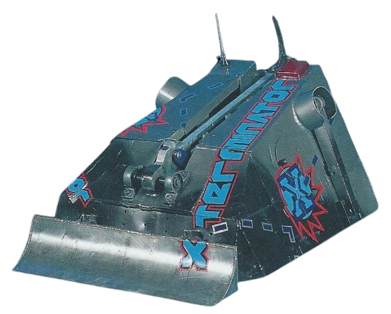 | X-Terminator | Series 3-6, Extreme 1-2 | Series 4 Semi-Finalist, used in tandem with a pneumatic axe (Series 3-6, Extreme 1-2) or flipping arm (Series 4 only). The scoop underwent several design changes throughout X-Terminator's appearances, and would later become a static weapon for its Series 7 incarnation. | X-Terminator in Series 6 |