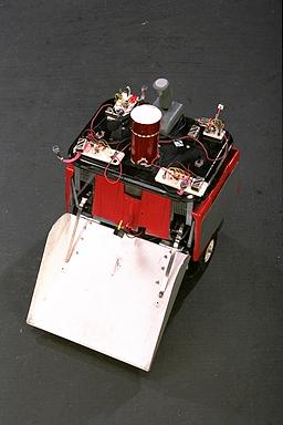 | Arsenic | 1996 US Championship | Featherweight; one of the first combat robots to feature a lifting scoop. Rear forklift-style weapon described as a 'scooper' by builder Steven J. Winter; featured three ground-scraping forks at its tip.[2] | Arsenic (background) raises its scoop during its Featherweight Melee match |
