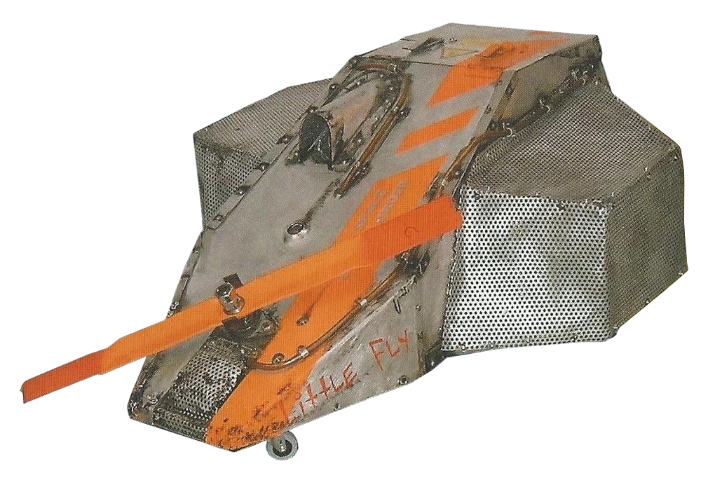 Little Fly was a grey box-shaped robot with aluminium armour and an orange lawnmower blade as its weapon. The blade spun at 1000rpm and was capable of inflicting considerable amounts of damage during its appearances in spite of its fragile appearance. However, the blade tended to jar if it struck metal, and was susceptible to bending after heavy impacts. Little Fly also featured two lights - one to indicate that the weapon was armed and ready, the other a novelty spotlight, for creating "confusion". However, it had a relatively low top speed of 4mph and a high 50mm ground clearance.