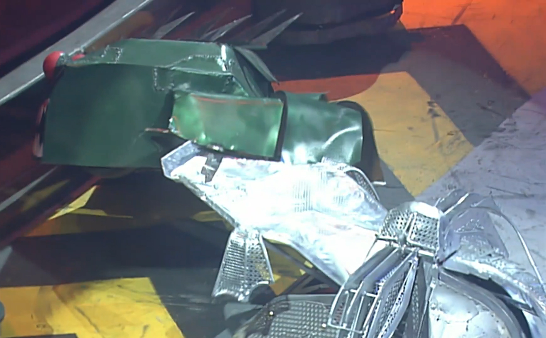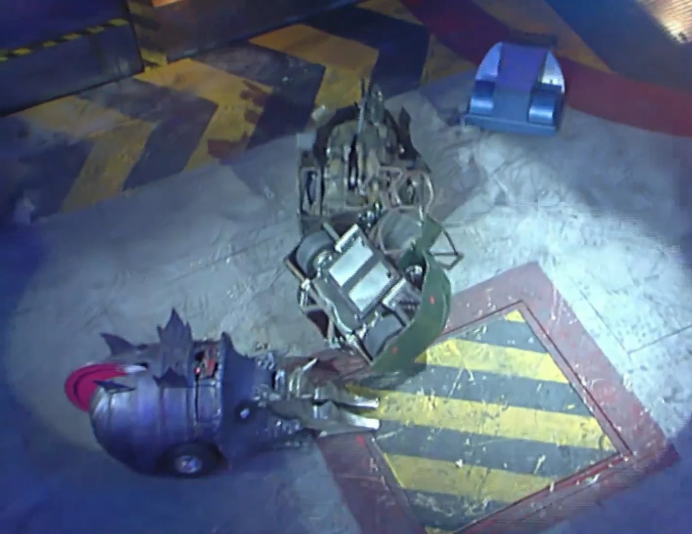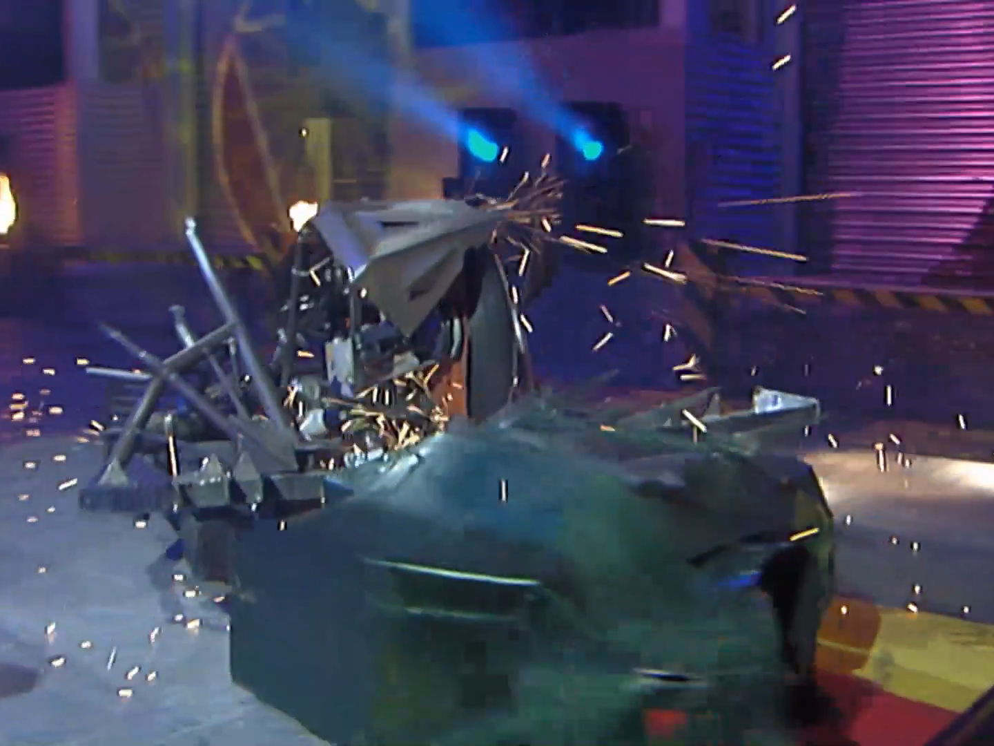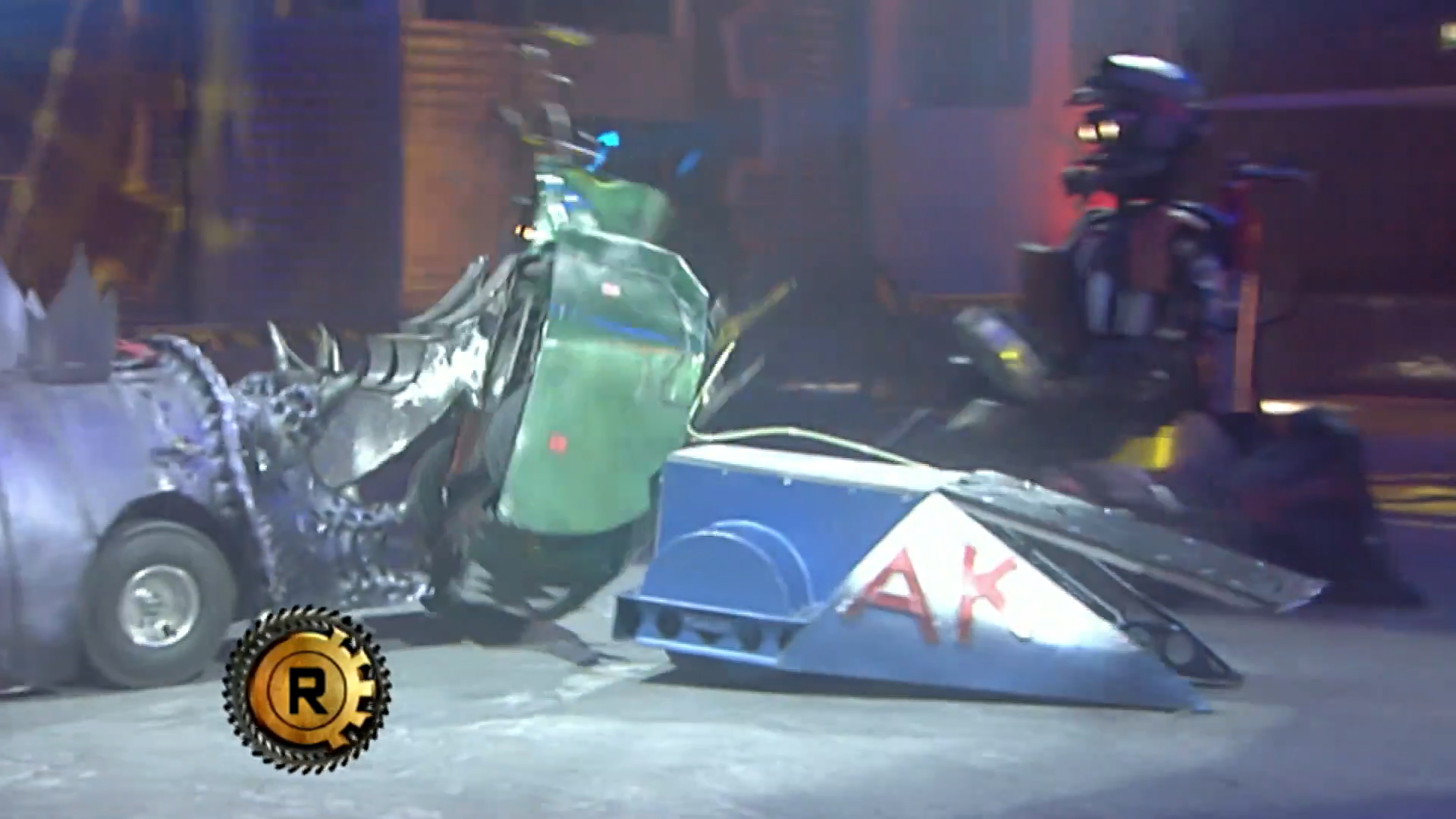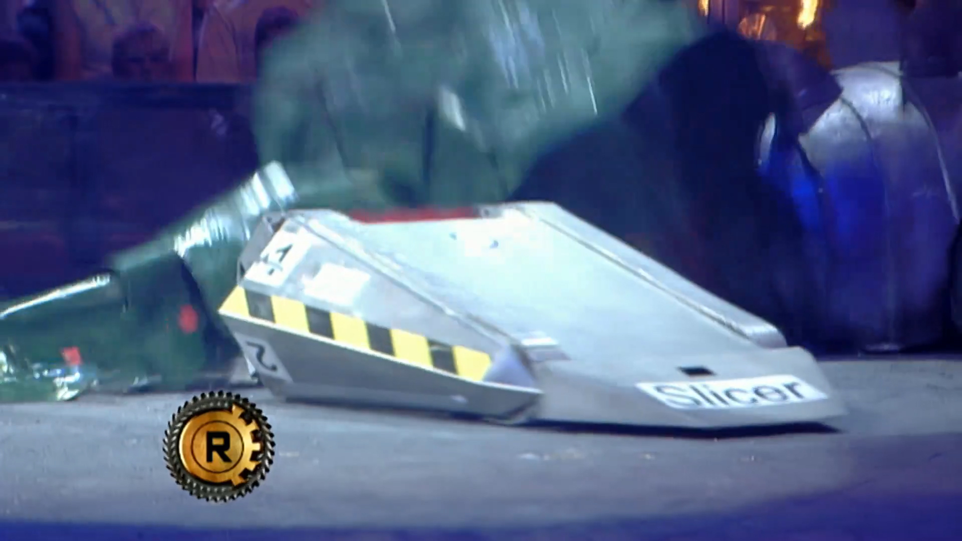 The two remaining competitors continued to attack each other, with Lizzard continuously pushing Slicer around while sustaining damage from the latter’s drum. Twisted Metal regained mobility in the meantime, with Lizzard pushing it towards Sir Killalot despite Refbot’s attempt to separate the two competitors. Lizzard’s tail was momentarily clipped by a charging Slicer, with Lizzard itself attempting to push Twisted Metal again as Slicer repeatedly tried to damage its bodyshell. It turned round before being rammed and lifted by Slicer again, with Sir Killalot leaving his CPZ to grab Lizzard by the tail just as Twisted Metal was being counted out. Nevertheless, Lizzard progressed to the next round along with Slicer.