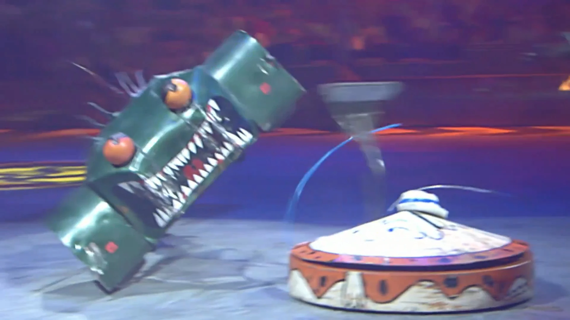 Lizzard drove around the arena to lure Bamm Bamm, hitting its opponent with the tail several more times. However, it suddenly stopped moving by the time Bamm Bamm pressed the Pit release button and was counted out. With this, Lizzard was eliminated from the competition for the second time.