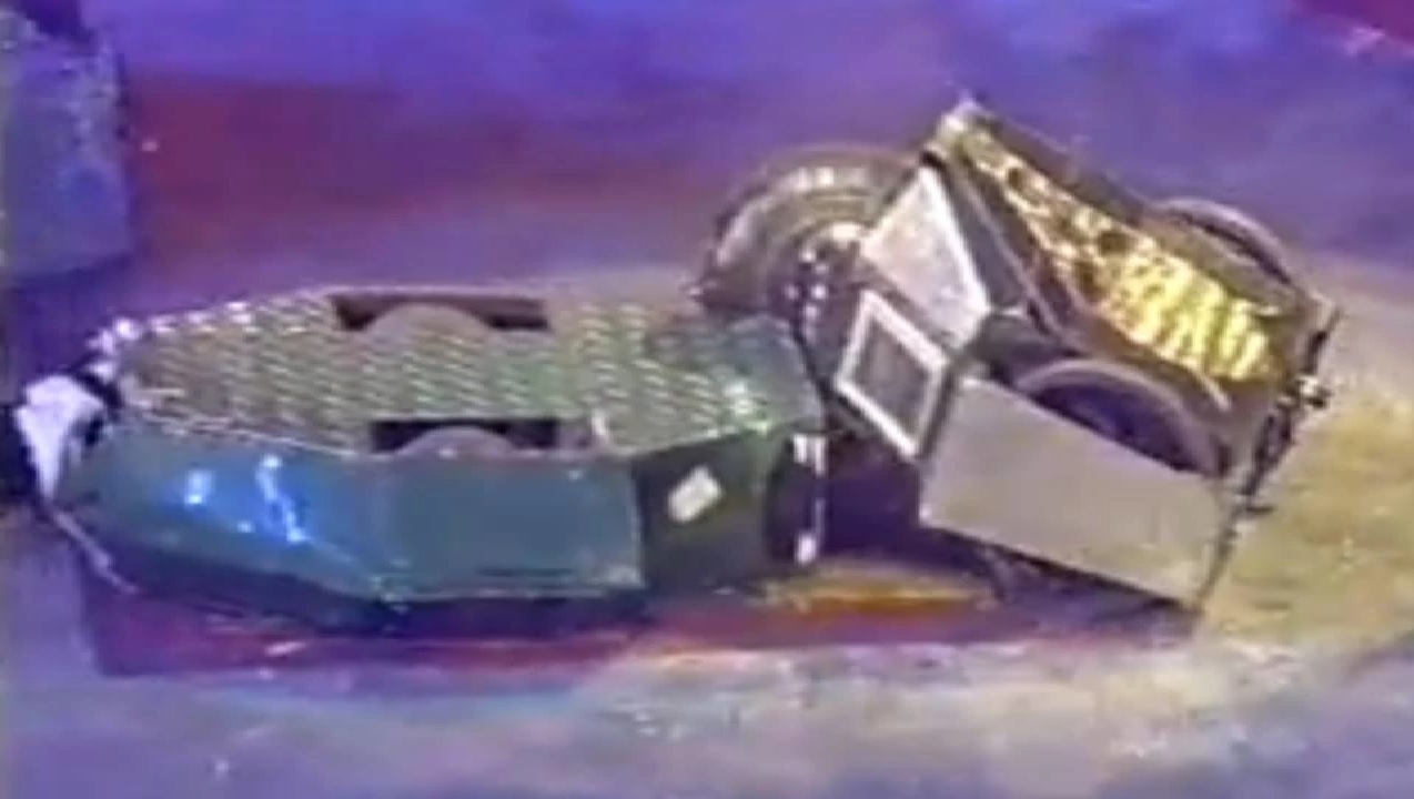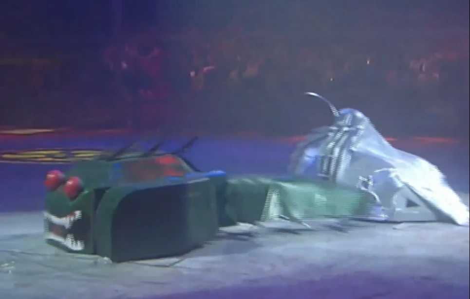 Lizzard would gain a third reprieve, however, when it was given a wildcard by the producers for a place in the Grand Final – the originally planned recipient, Pullverizer, was too heavily damaged to receive it. In the Grand Final itself, it faced Twisted Metal and Slicer in the first round, which it began by spinning around and avoiding Slicer’s drum. Lizzard spun round in an attempt to hit Twisted Metal with its tail, but had one of its tail panels torn off by the latter’s disc; the impact immobilised Twisted Metal almost immediately. After attempting to hit and momentarily being lifted off the floor by Slicer, Lizzard nudged the rear of Twisted Metal, before whacking it twice. It was pinned against the latter by Slicer, before driving away and spinning around on the spot.