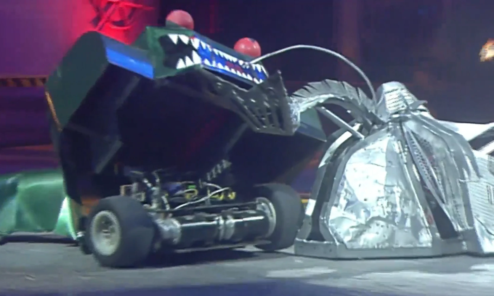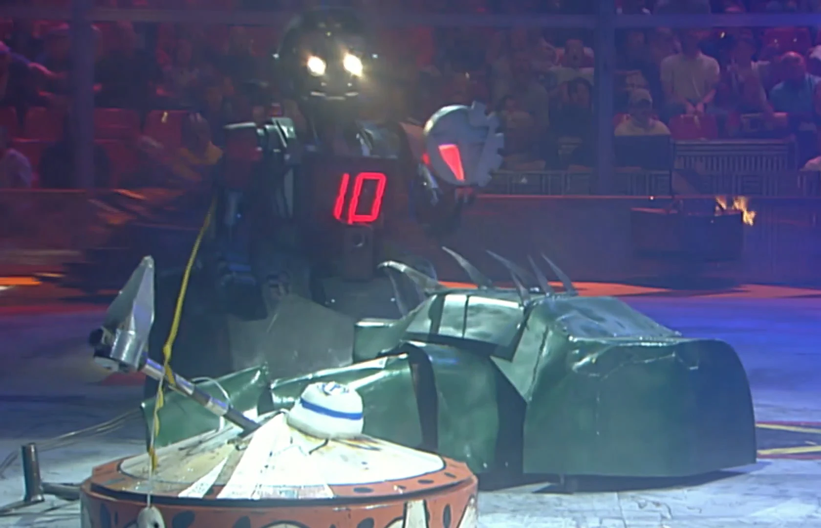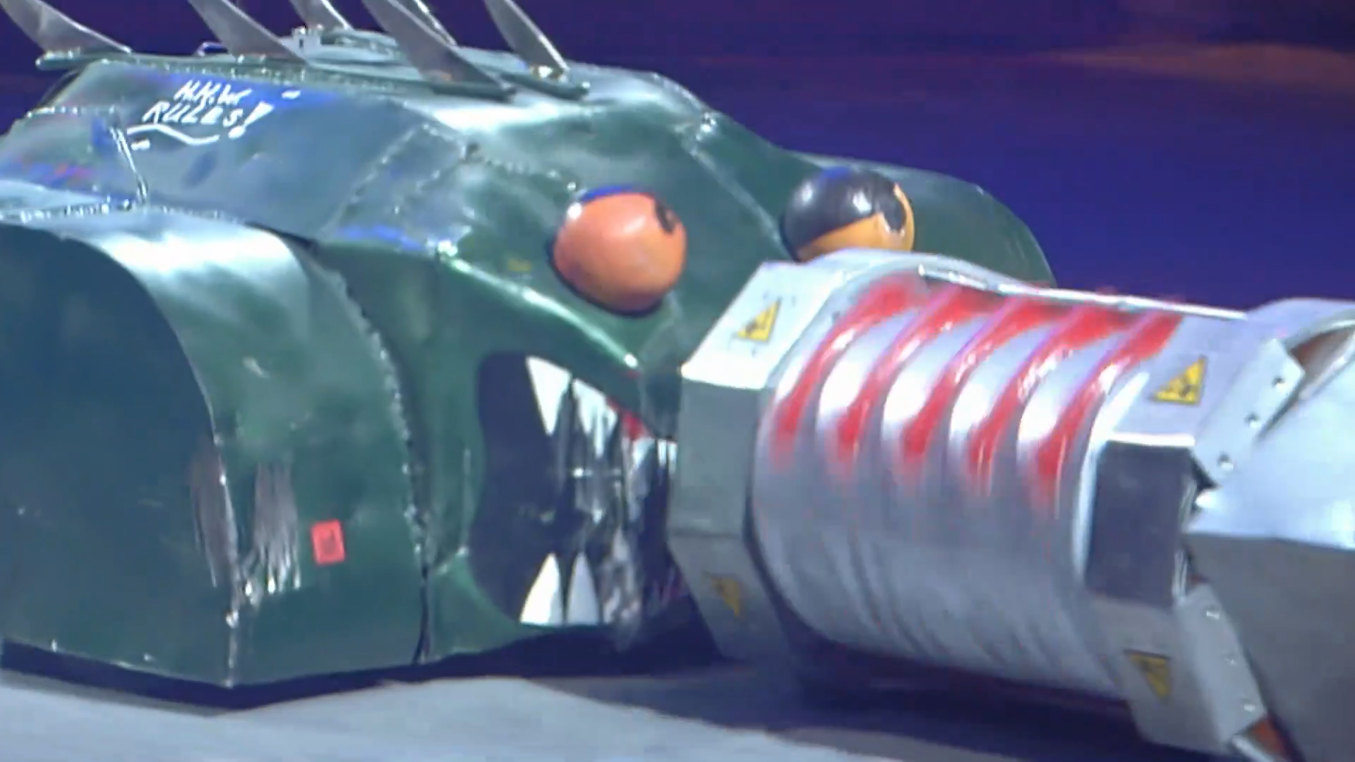 Despite almost backing into the Pit, Lizzard drove into the side of Arena Killer and hit it several times with its damaged tail; both competitors eventually ended up in Shunt’s CPZ, where the House Robot axed, lifted and turned Arena Killer over. Lizzard pushed the inverted Arena Killer off the Floor Flipper and back into the CPZ, allowing Shunt to cause more damage to its opponent. It lost its eyes again as it rammed the re-righted Arena Killer, and pushed the latter around in circles again despite driving too close to Matilda’s CPZ at one point.