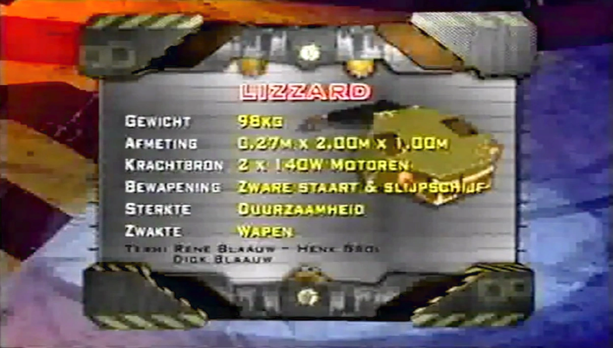 Lizzard made its Robot Wars debut in Heat A of Dutch Series 1. In its first-ever battle, it faced Belgian competitor Philipper.