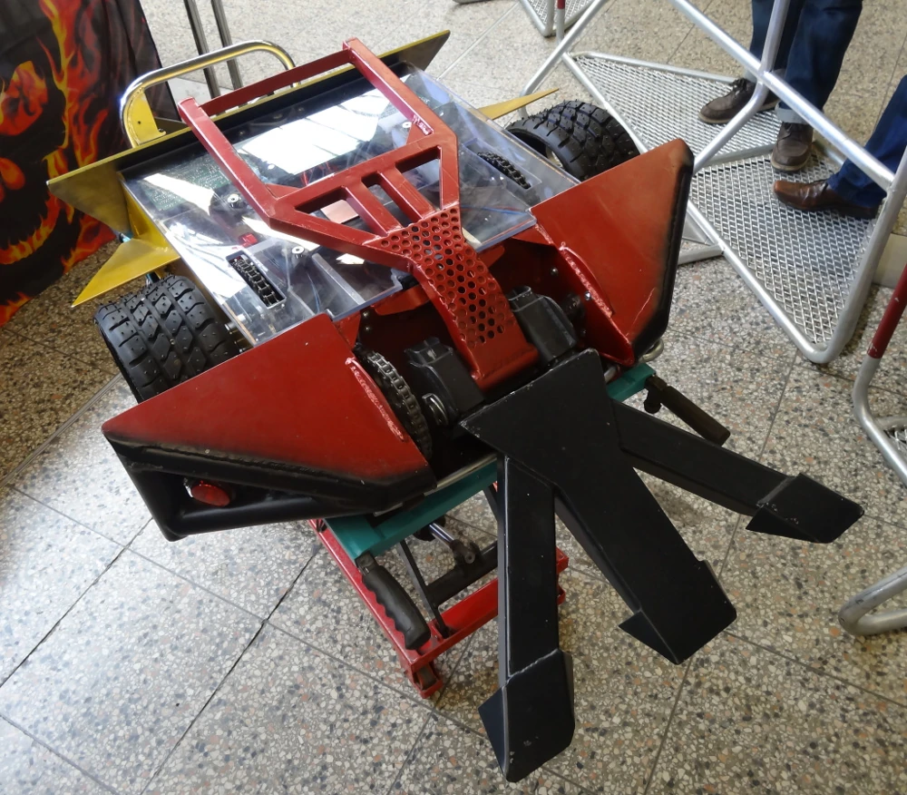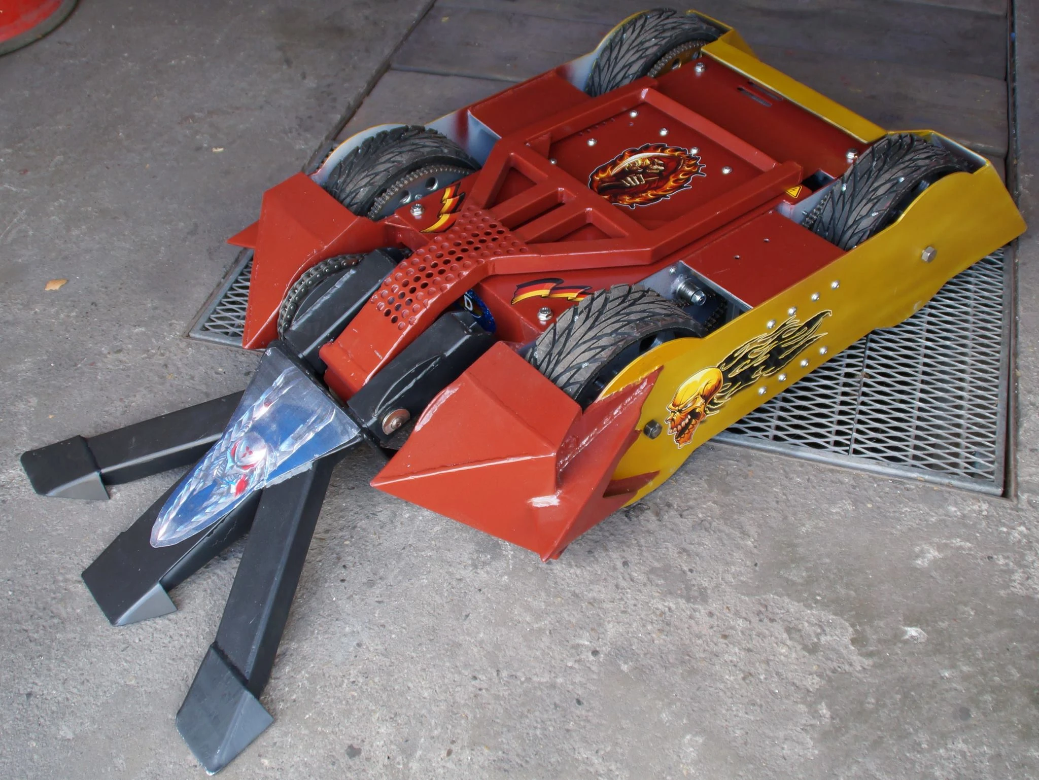 Luzifer can be seen as the spiritual successor to the incumbent German Robot Wars champion, Black Hole. After Robot Wars began its 12-year hiatus, the original team built Black Hole 2 with a much higher emphasis on pushing power, and later sold this to The Devil Crew, who rebuilt the robot as Luzifer in 2003. The 2016 build of Luzifer bears very little relation to the original Black Hole 2.