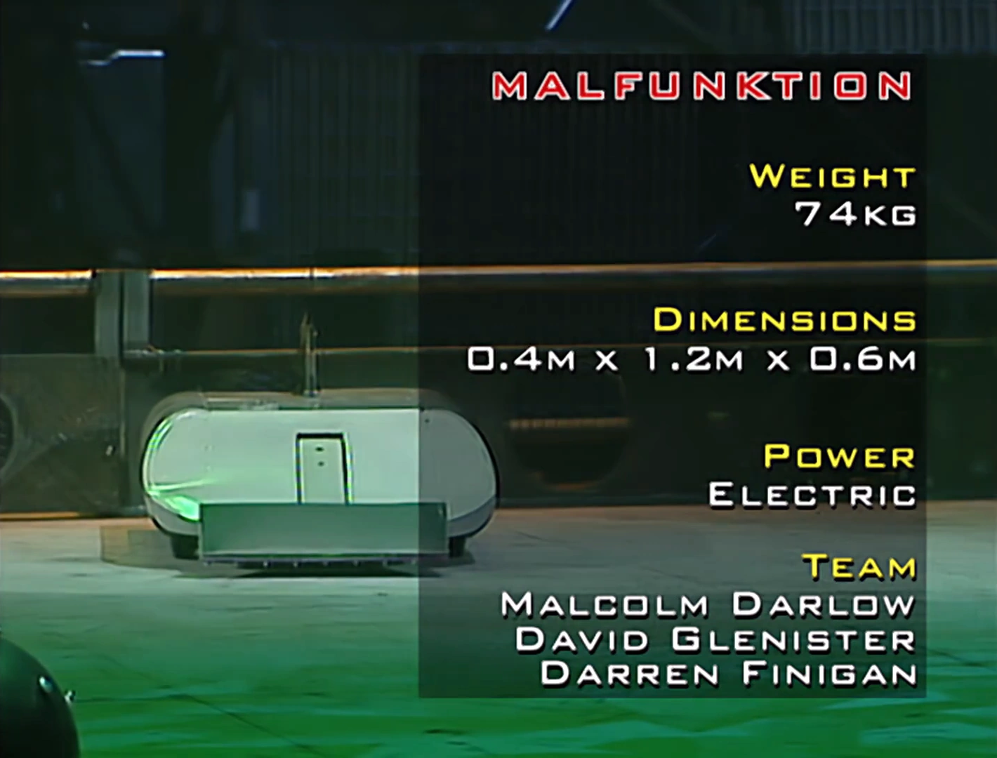 Malfunktion was a rounded box wedge-shaped robot armed with a lifting scoop and a circular saw. It had a high ground clearance, but the robot saw little action in its only appearance.