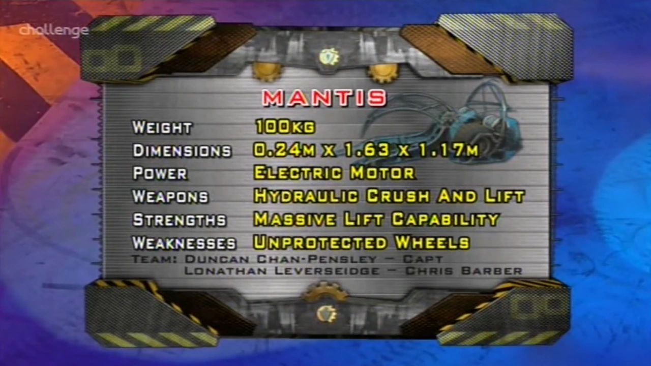 Mantis was a two-wheeled robot, armed with three long lifters, with a massive lift capability, and a hydraulic crushing beak, meaning it could lift and crush simultaneously in a similar fashion to Tetanus. The main tactics were to grab hold of opponents and then drop them in the Pit or out of the arena, but it never succeeded in either. The lifter and crusher did prove very effective however at holding opponents off the arena floor, and carrying them to the CPZs or hazards such as the flame jets.