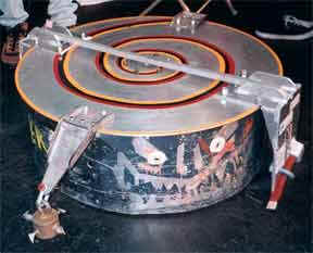 Mauler 95, the first heavyweight incarnation, introduced a custom cylindrical design with a 'roll-formed aluminum plate',[19] plus a larger and more powerful overhead spinner. The spinner comprised of a top-mounted horizontal disc with four triangular blade-like extensions, from which spiked maces were suspended by chains. The maces would again provide the robot with a 360-degree attack range, striking opponents veering close enough to it. Two Grainger drill motors formed the basis of Mauler 95's drive system.[20]
