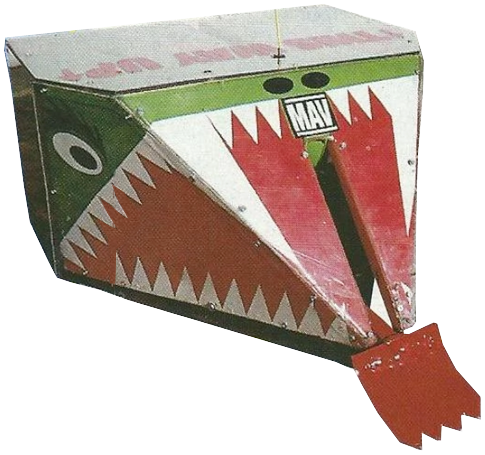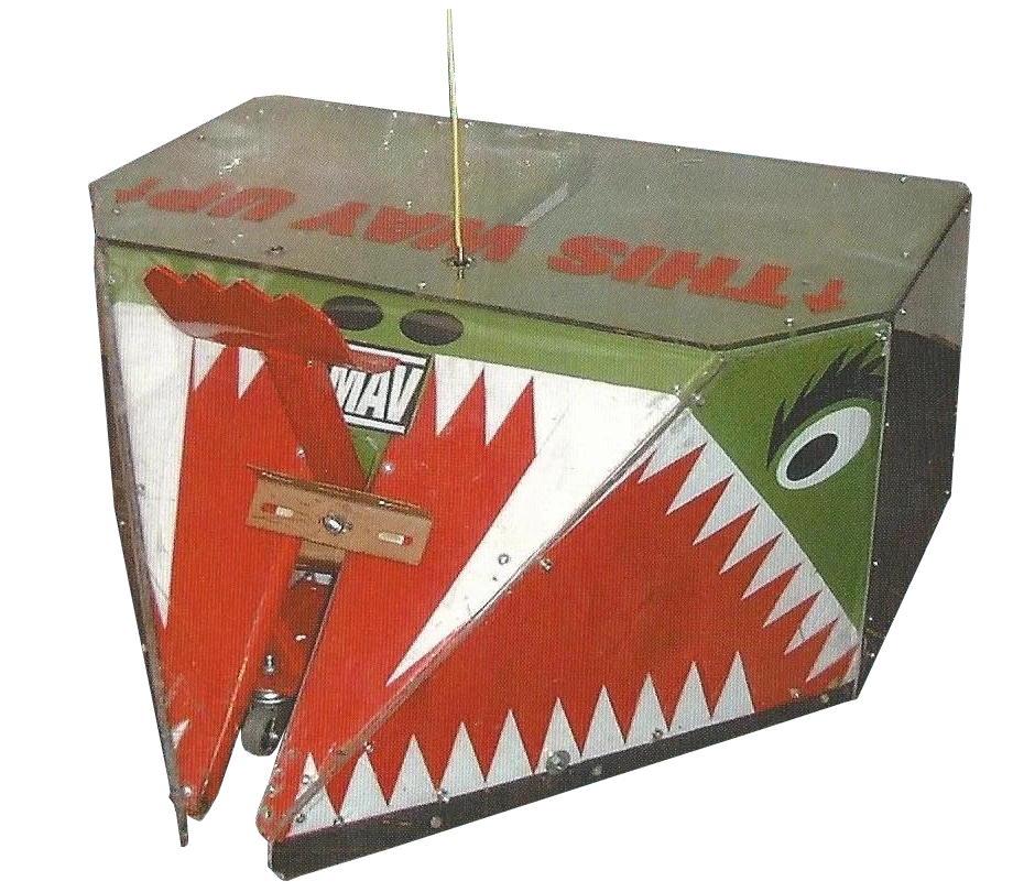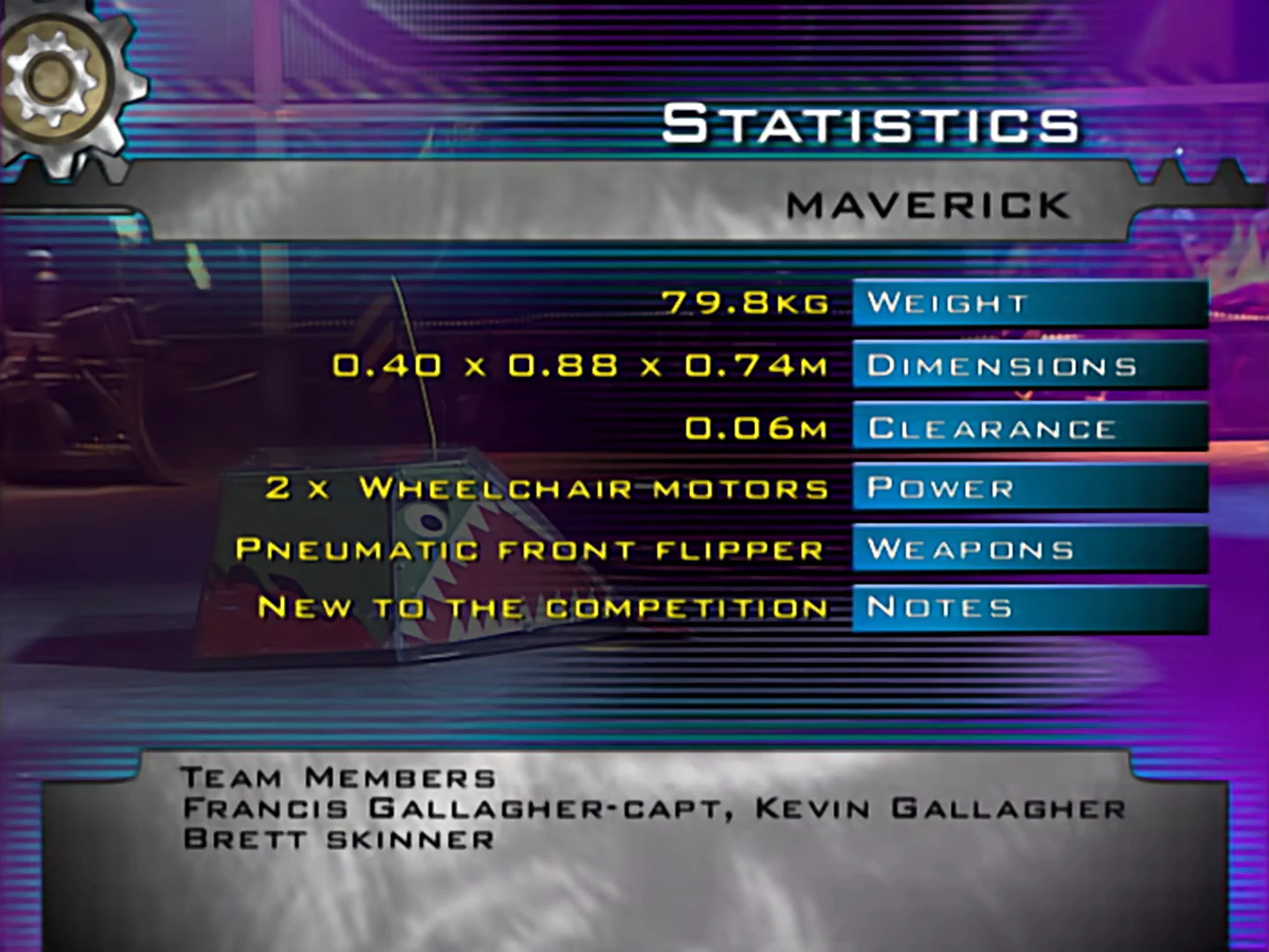 Maverick was a box shaped robot with a wedge shaped front. Powered by two wheelchair motors for a relatively slow top speed of 6mph, Maverick's weapon was a pneumatic lifting arm, powered by a sodastream bottle and a truck actuator. Its plastic shell gave the robot a 6mm ground clearance. The lifter was relatively capable of overturning other robots, and had a reasonably low wedge for its time, but it provided no assistance in self-righting, which proved critical in Maverick's defeat via overturning.