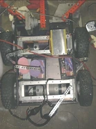 MechaDroid showed good speed, manoeuvrability and pushing power throughout its appearances thanks to its four NPC wheelchair motors and four Hawker-sealed lead acid batteries, with a fifth NPC wheelchair motor powering the weaponry. The robot's batteries were topped with sponges for internal padding. Although its tires were exposed, which potentially left them vulnerable to being damaged by various weapons, the tires were foam-filled to minimise damage received upon impact and allow the wheels to keep working when damaged. The robot used Anderson connectors, and a Futaba 1024 receiver to connect to its driver's Futaba 6XAS transmitter.[1]