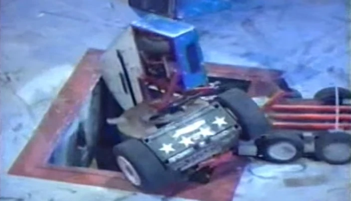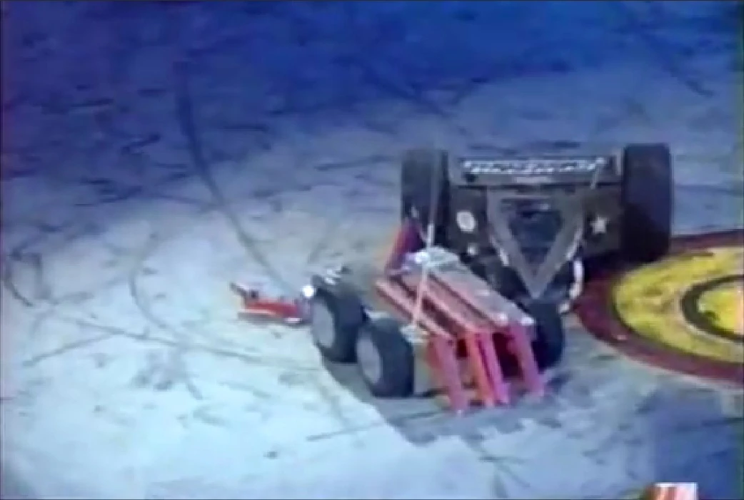 MechaDroid started tentatively by turning and driving towards Darkness, but stopped, before Darkness pushed it across the arena. It recovered to axe and push Techno Trousers into a CPZ, but was attacked by Sgt. Bash before continuing to shove Techno Trousers into Sir Killalot, Darkness and the Pit release button. In doing so, MechaDroid got one of its pincers caught in Techno Trousers' leg, before it and Sgt. Bash pushed and dragged it out of the CPZ near the Pit release button. Darkness, meanwhile, nudged Mechadroid towards the Pit, then fully in, although not without falling in itself. As a result, Mechadroid was eliminated from the US Championship despite its strong performance.