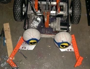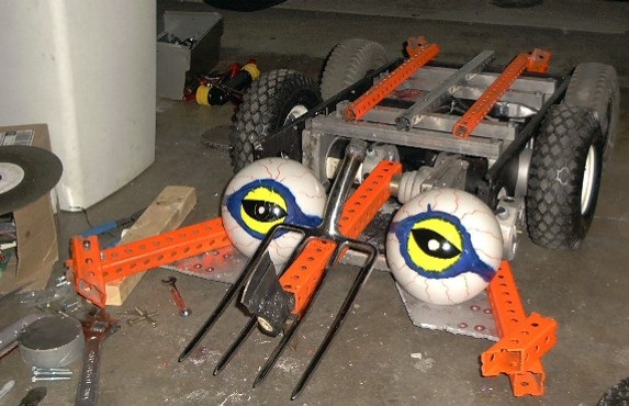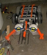 Many of the team's build photos show MechaDroid equipped with a pitchfork attached to its axe, likely a reference to the electric pitchfork weaponry of the team's Robotica entry i-Droid. This was gestured in a way that suggested it was possible to use the axe as a spiked wedge, though it is unclear if the team ever intended to use the pitchfork in battle.