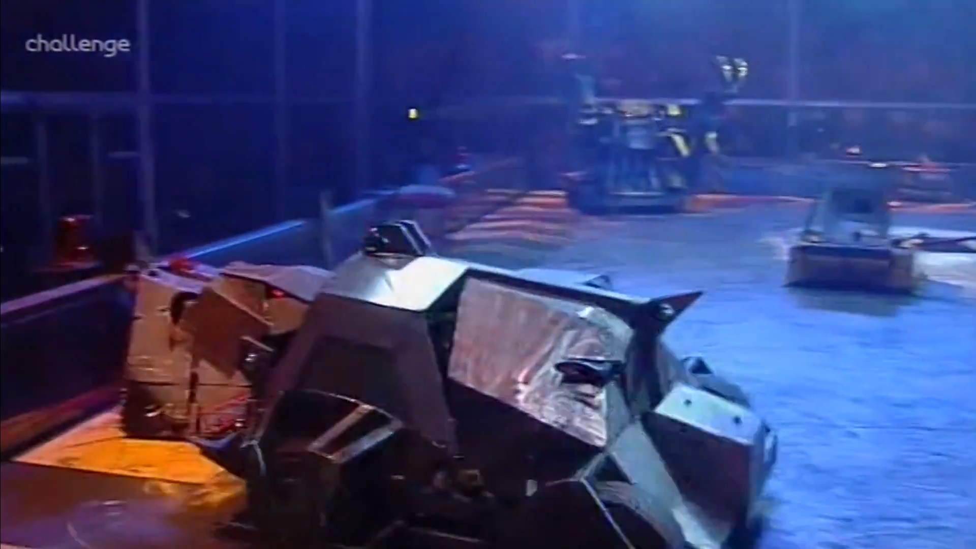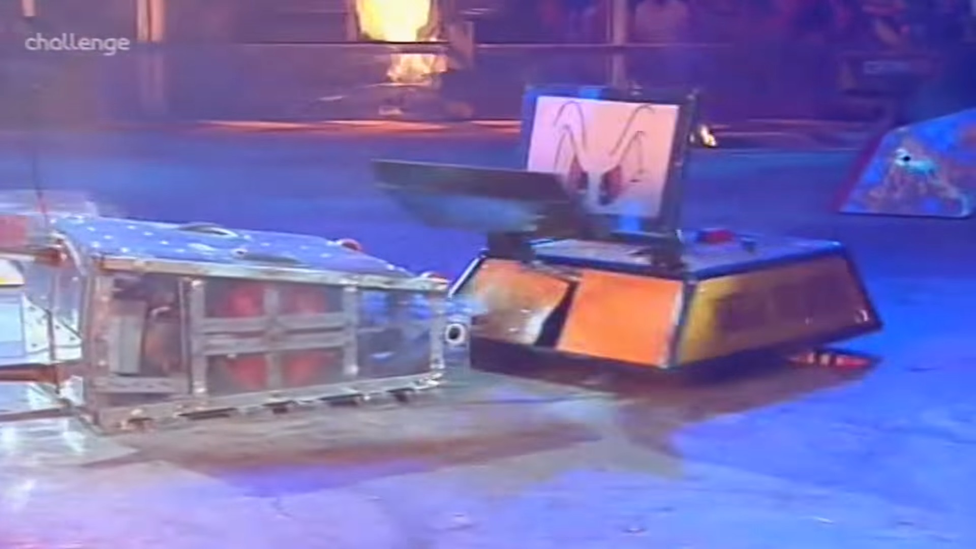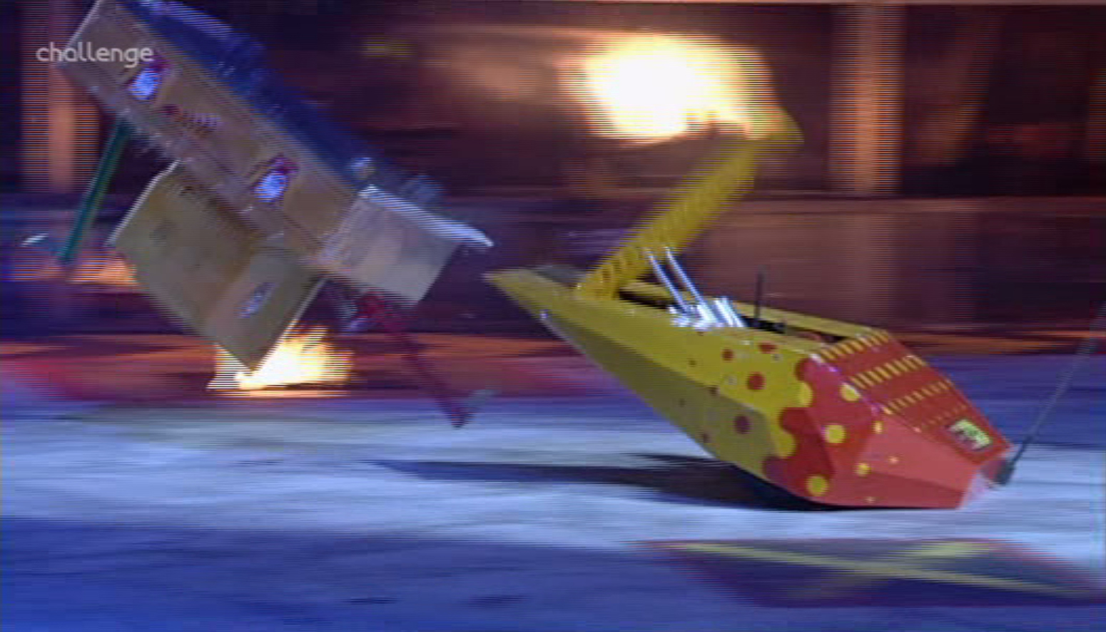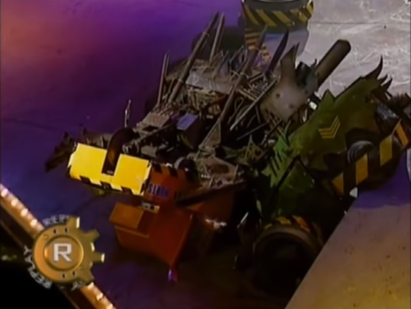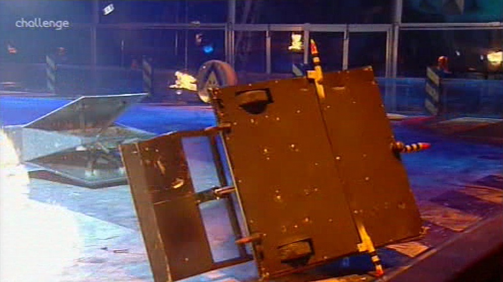 Not long afterwards, Firestorm 4 drove straight into the Pit whilst chasing Cedric Slammer, which had been righted, but as Mega Hurts 2 and Firestorm 4 were the last two robots to be immobilised, they were both put through to the next round of the heat by the Judges.