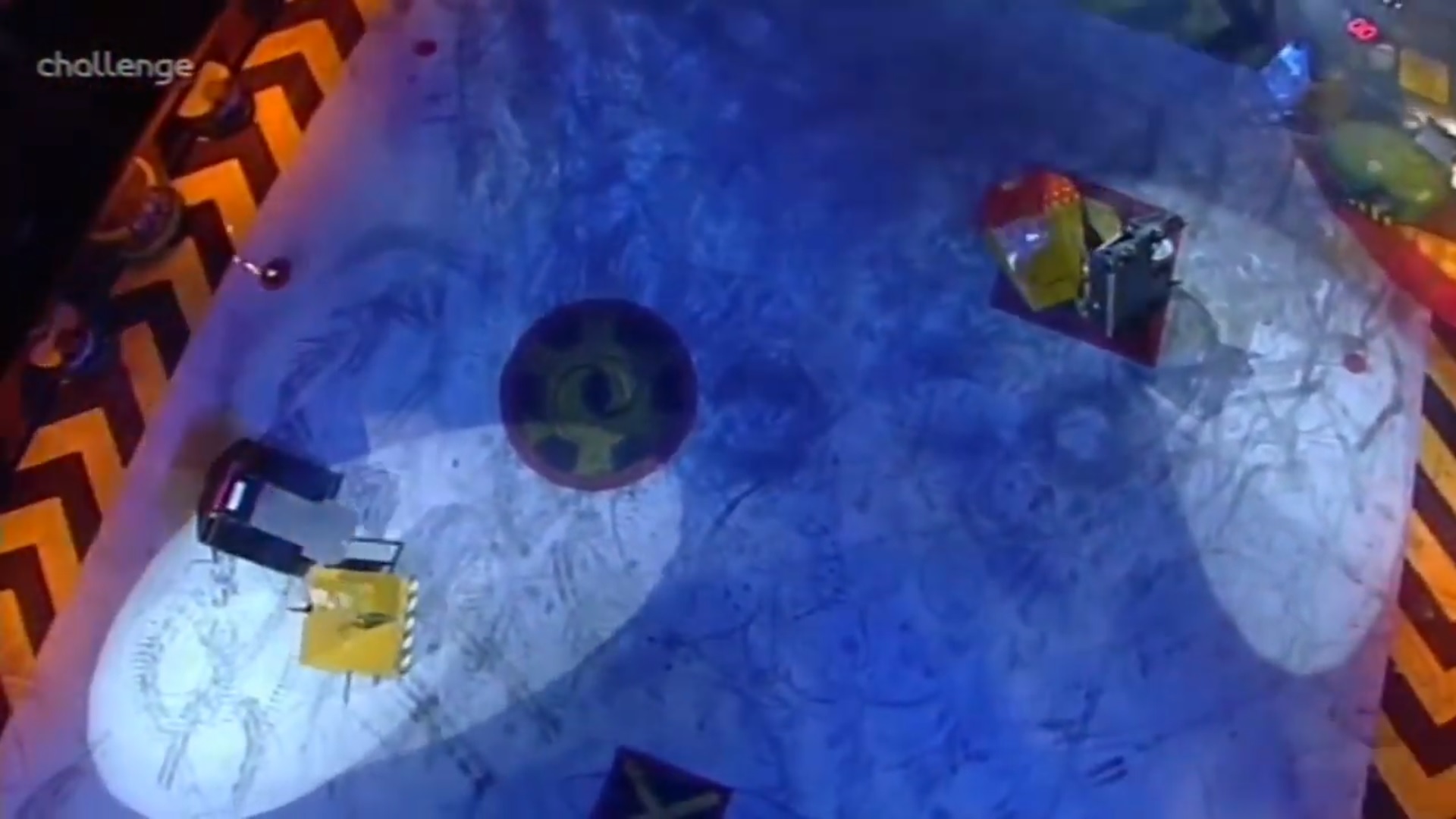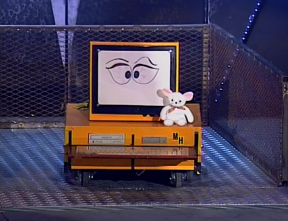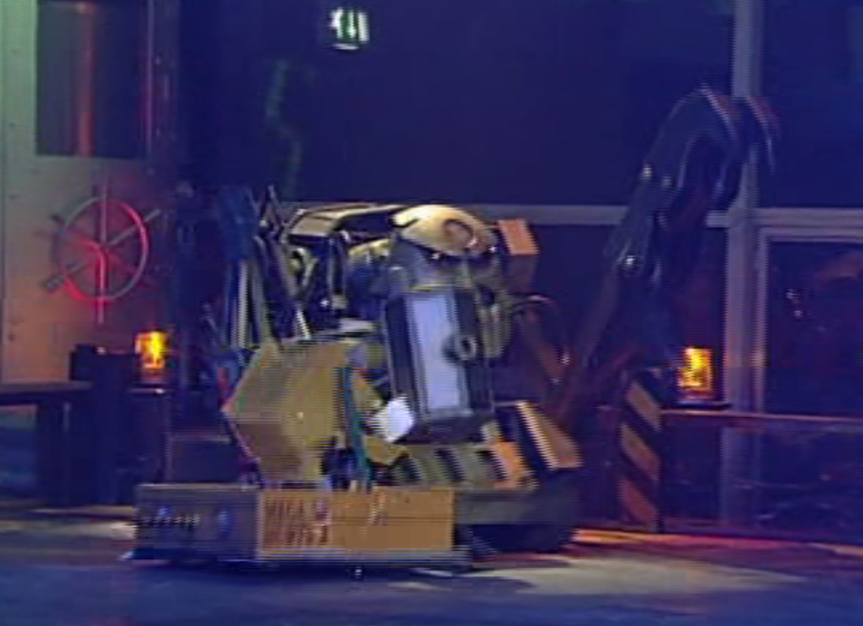 Mega Hurts 2 got off the Flame Pit, but X-Terminator soon got off the flipper. X-Terminator 2 got at the side of Mega Hurts 2 and pushed, firing the axe, which landed onto the monitor then slid onto the body, doing no damage. X-Terminator pushed Mega Hurts 2 into the CPZ, but as it tried to reverse out, Growler rammed into it, slamming it against the arena wall. X-Terminator managed to reversed away, and Mega Hurts 2 was cornered by the House Robot, which pinned it into the corner and grabbed the body in his jaws. Growler pulled Mega Hurts 2 out of the CPZ, and pushed it up the arena and spun it around, throwing it aside. Mega Hurts 2 drove at X-Terminator, but couldn't get under the front, so turned around to try again. Mega Hurts 2 got its flipper under the front of X-Terminator, but only lifted the front scoop. X-Terminator fired the axe but narrowly missed. The two competitors turned around, and X-Terminator got under the front corner of Mega Hurts 2 and pushed it back, but Mega Hurts 2 reversed.
