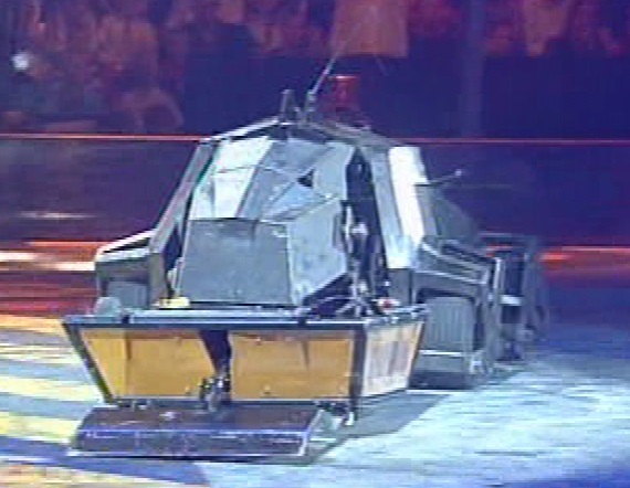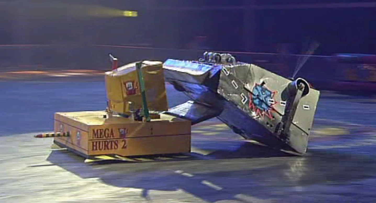 Mega Hurts spun on the spot with its weapons raised as the House Robots took a slow approach up the ramps. Sergeant Bash drove into the back of it, whilst Dead Metal got at the other side and grabbed it with his pincers, then reversed, closed the pincers and pushed Mega Hurts. This pushed Mega Hurts free of Sergeant Bash, and it turned around and drove away from the House Robots, with Dead Metal following it, but Mega Hurts drove too far, driving to the edge of the ring, where it precariously balanced on the side, unable to get back. Dead Metal and Sergeant Bash got in position and pushed Mega Hurts off, with both House Robots falling off as well