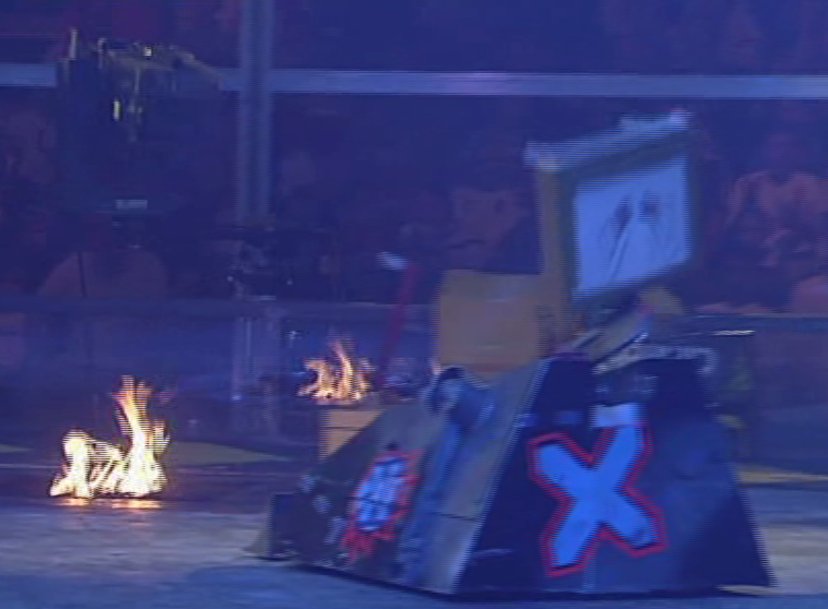 X-Terminator charged across the arena at Mega Hurts 2, which fired its flipper as X-Terminator collided with it, and the impact sent X-Terminator spinning away. X-Terminator quickly recovered, reversing and driving past Mega Hurts 2. Mega Hurts 2 turned around, but drove onto the flame pit as it did so. It quickly got off, but when it tried to line up an attack, it overturned, then overturned again when trying to correct its mistake. This delay allowed X-Terminator to get under the front of Mega Hurts 2. X-Terminator reversed for another charge, and when Mega Hurts 2 turned, exposing its side, X-Terminator charged at it and rammed it onto the Flame Pit. As Mega Hurts 2 turned off the flames, X-Terminator hit the monitor with its axe, hitting the front and ripping it clean off. Mega Hurts 2 turned around, and as X-Terminator drove at it, it got the flipper under the front of X-Terminator, lifting it up.