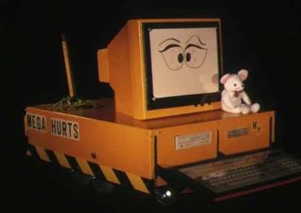 Other elements of Mega Hurts' design strongly reflected its computer theme, including a monitor with a pair of eyes (which contained the robot's receiver), a mouse mascot and even a fully-functioning CD drive. It had four wheels, which were located in the middle, despite the robot's rectangular shape. It had a high ground clearance of 40mm, but according to Jonathan Pearce, the robot could wedge itself into the arena floor.