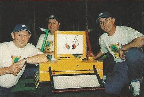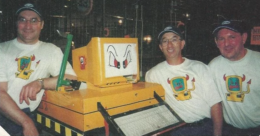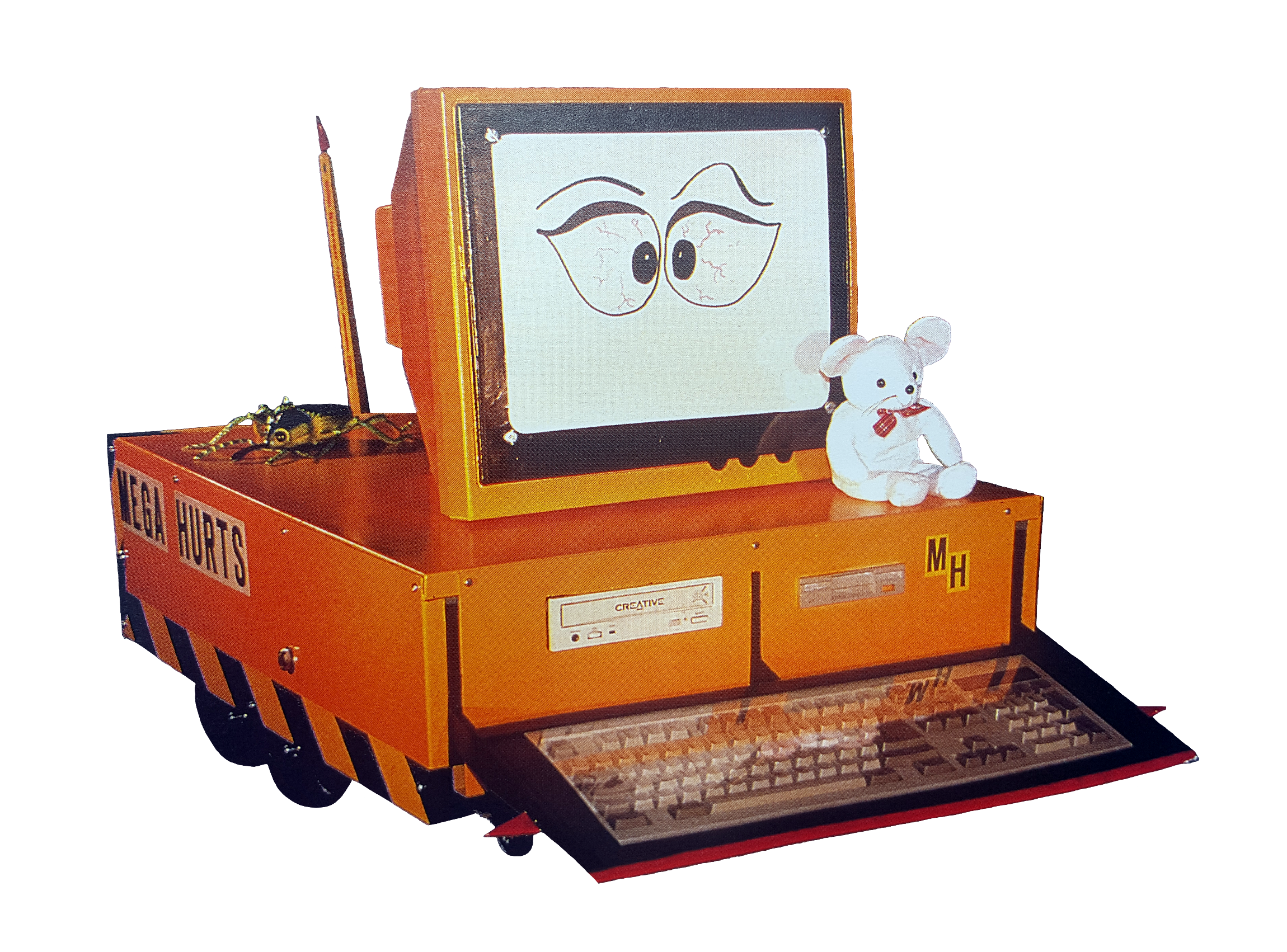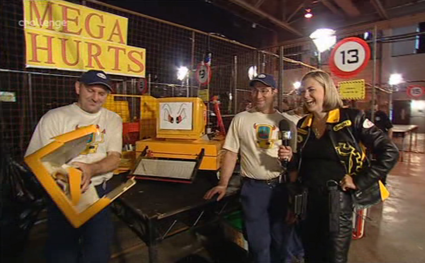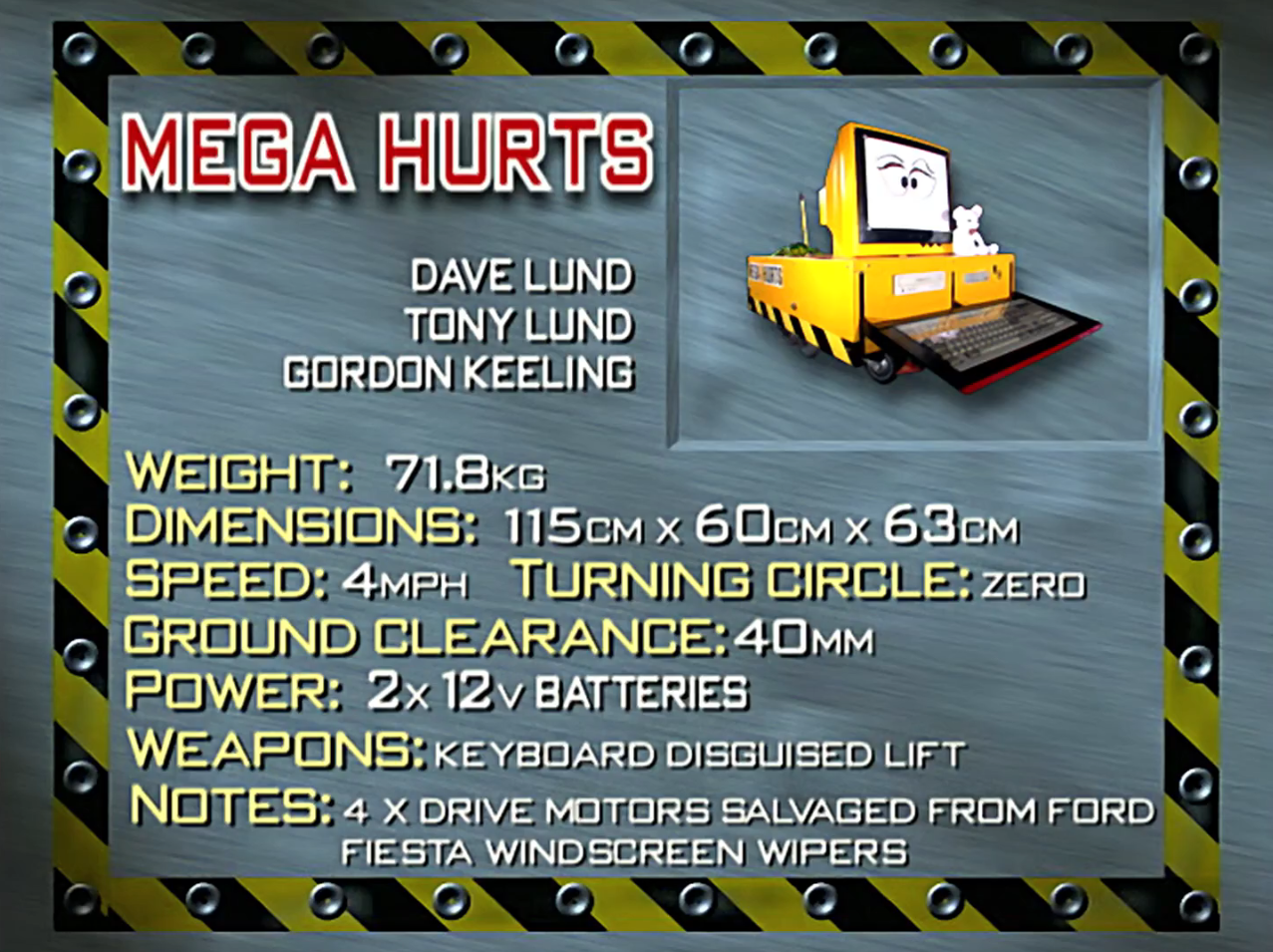Weighing 71.8kg, Mega Hurts was a yellow box shaped robot based on a desktop computer. It was powered by two 12V batteries and four drive motors, salvaged from Ford Fiesta windscreen wipers, delivering a low top speed of 4mph. For weaponry, it was equipped with a lifting plate, designed to look like a computer keyboard, referred to on the show as a 'keyboard disguised lift', and a rear 'power hacksaw chisel'. Similar in form to a conventional spike or spear, the 'chisel' was unusual in that it could not only be lowered or lifted upwards, but also move in a reciprocating motion to cut away at opponents. The weaponry was powered by three windscreen wiper motors,[1] again sourced from Ford cars as mentioned in Robot Wars Revealed.