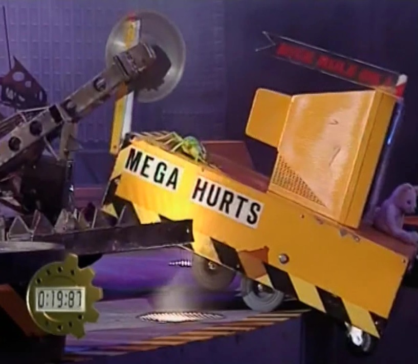 Mega Hurts was a heavyweight robot which competed in multiple series of the original UK Robot Wars, debuting in Series 2 and making further appearances in Series 6 and 7. Its most recognisable feature was its computer-inspired theme, which influenced the design of all three of its televised incarnations. On each occasion, Mega Hurts did not progress beyond the heats, its best finishes being the Trial stage in Series 2 and the second round of the combat-only Series 6.