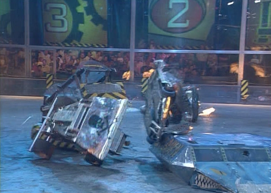 A standard three-way Eliminator in Series 4 (Gravedigger vs Thermidor 2 vs Kronic the Wedgehog, Heat G)