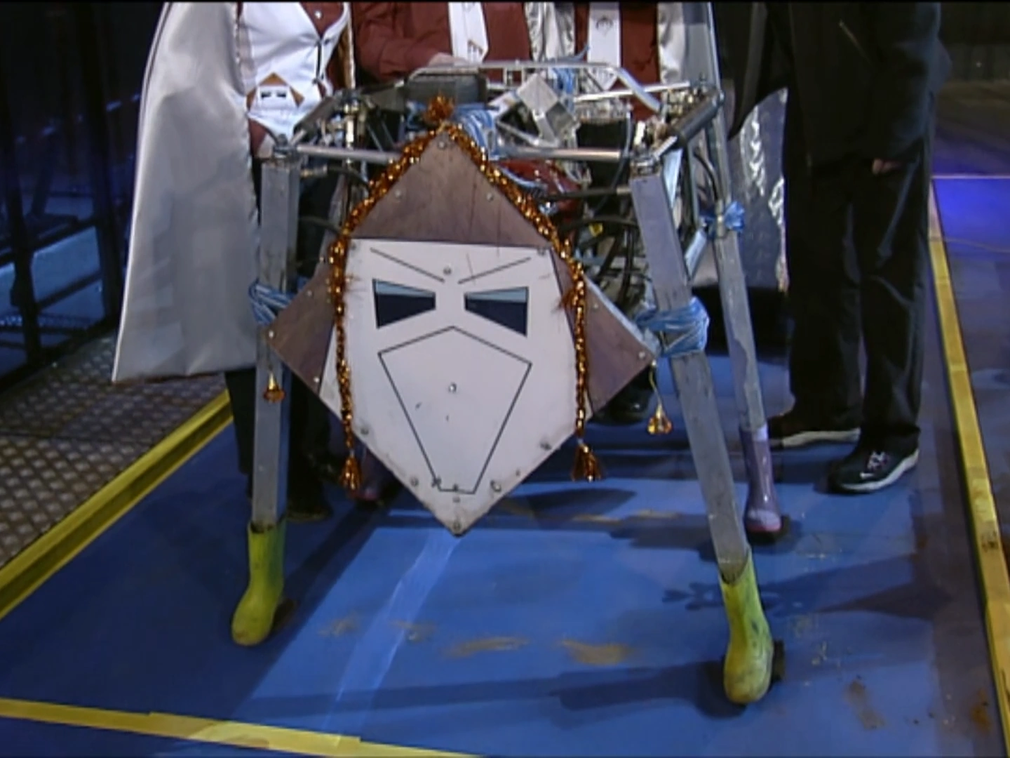 Miss Struts was consistently decorated with custom-painted face panels, mock hair and hair curlers at the front. Ahead of Series 3, the bungee cords were also replaced and changes to the software made to improve general responsiveness and smoothness in the second walking programme.[6] Pairs of yellow (front) and purple (back) boots were added above the main feet, which were supported by rubber stops at the base to provide extra grip on the arena floor. The stops were implemented following difficulties encountered at the Series 3 auditions (see Qualification),[7] and fully adopted following successful trials at the Bledlow Ridge School Fete prior to filming.[8] The Team EyeEye website listed Miss Struts' legs as capable of 'Lifting', 'Ramming' and 'Kicking' opponents.[1] A further change seen in Series 3 was the addition of a triangular yellow beam to the base of the chassis, providing spiked rams at both ends.