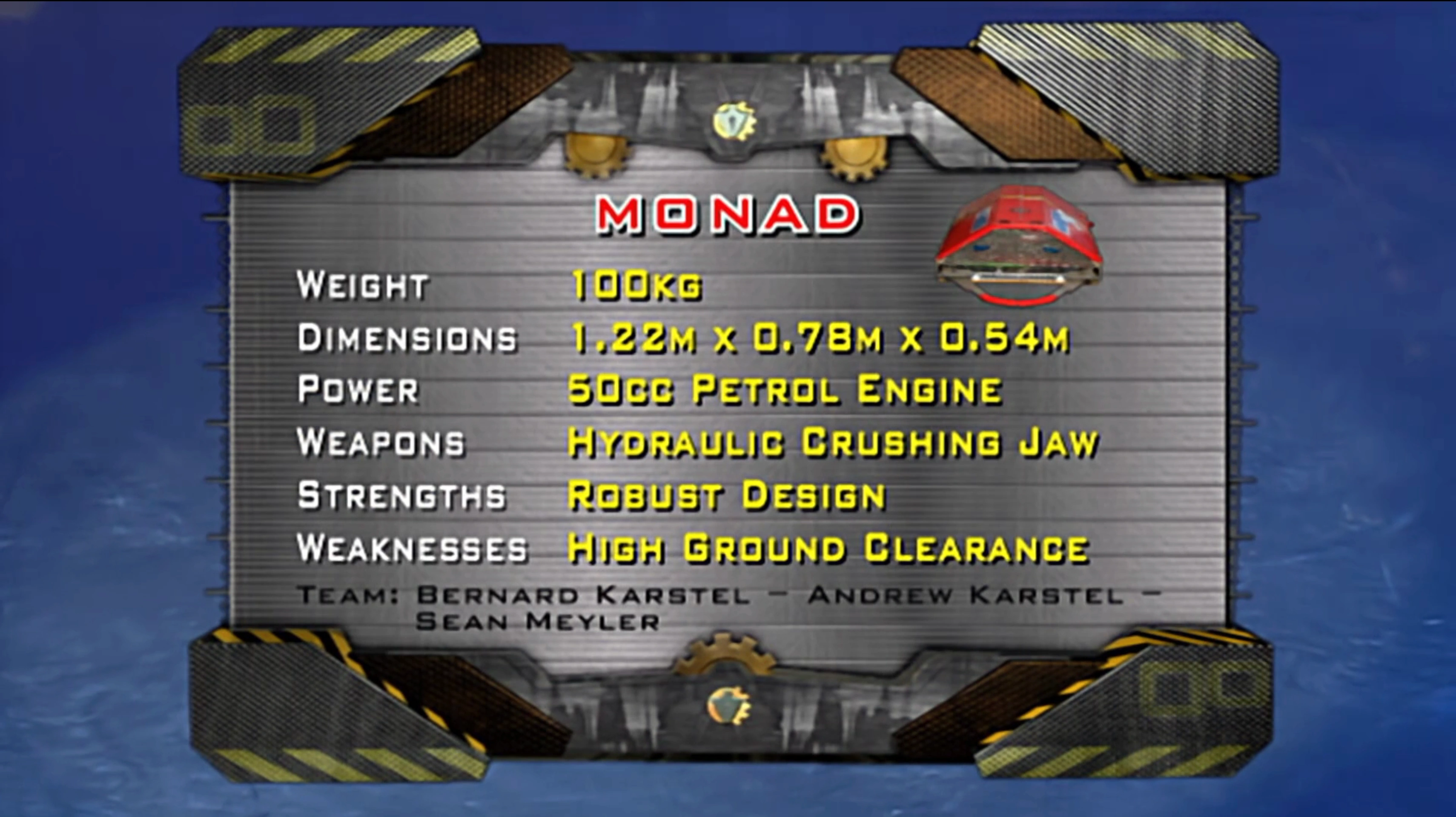 Monad was a boxy prism-shaped robot with four-wheel drive and a set of small horizontal crushing pincers as its weapon. The pincers were claimed to be capable of crushing an 18-inch concrete block, and the robot demonstrated decent speed and pushing power in its only battle. However, Monad had no self-righting mechanism, a ground clearance of 5cm (one of the largest among Series 5 competitors) and noticeable stability issues which resulted in it tipping on its front or back ends whenever it quickly changed direction. Additionally, its armour was fairly weak, which allowed it to be easily damaged by Tiberius 2.