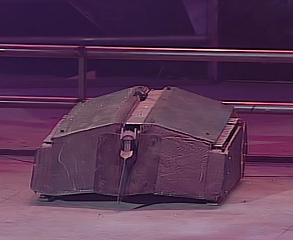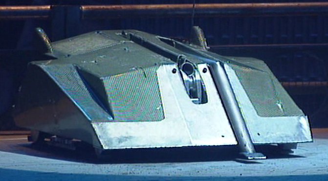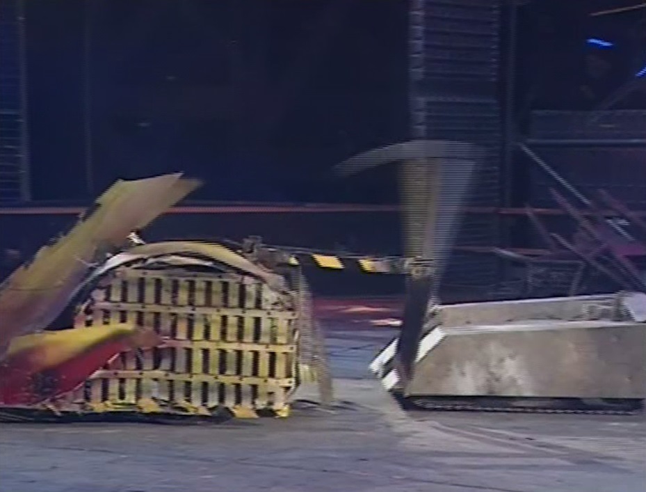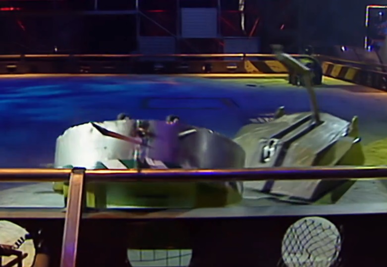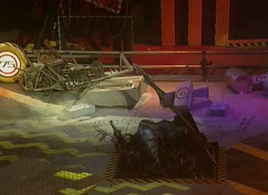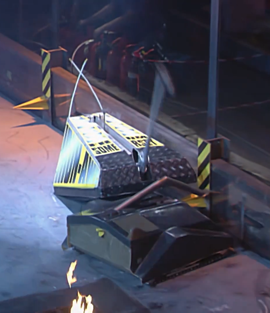 Mortis momentarily backed away, before pushing and axing Leighbot again simultaneously. It then retreated across the arena towards Matilda’s CPZ, turned, and pierced through Leighbot’s top armour again before backing fully into the CPZ. Mortis recovered to ram Leighbot again, this time getting underneath and turning it over into a Grille. With this, it emerged victorious, although Rob Knight admitted afterwards that he was surprised by the lack of power in the tantō weapon.
