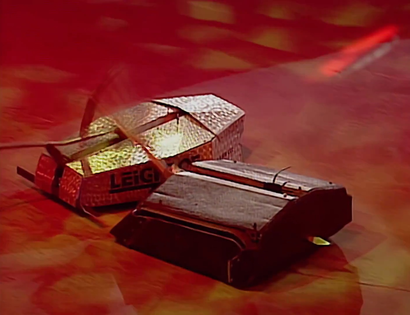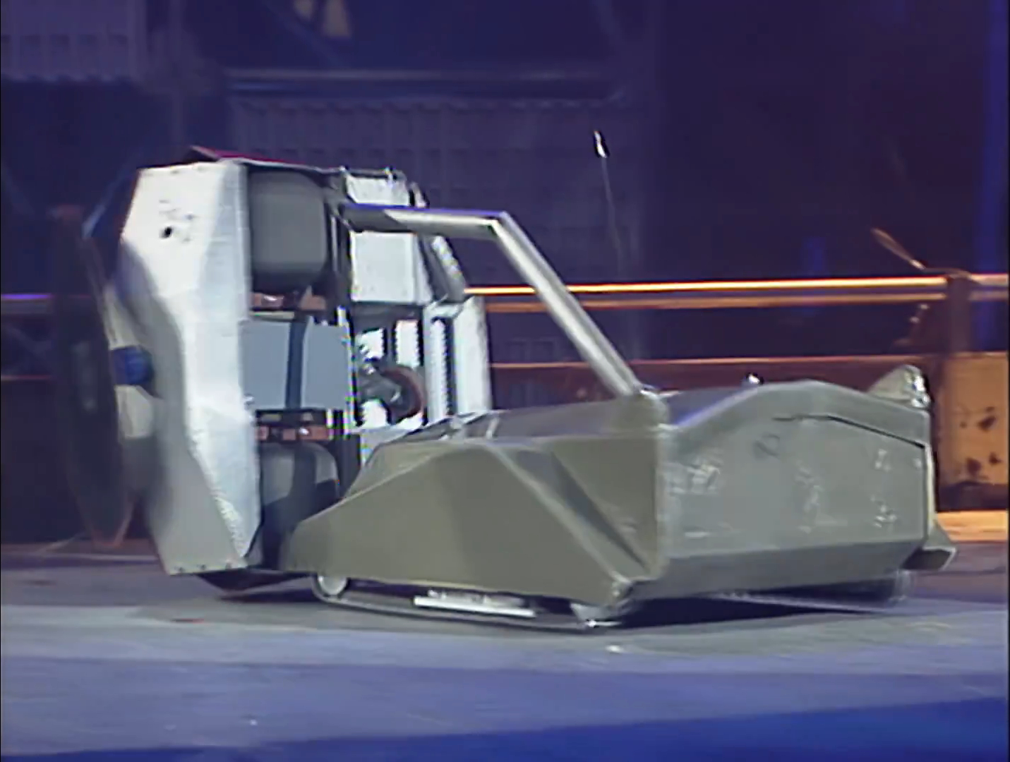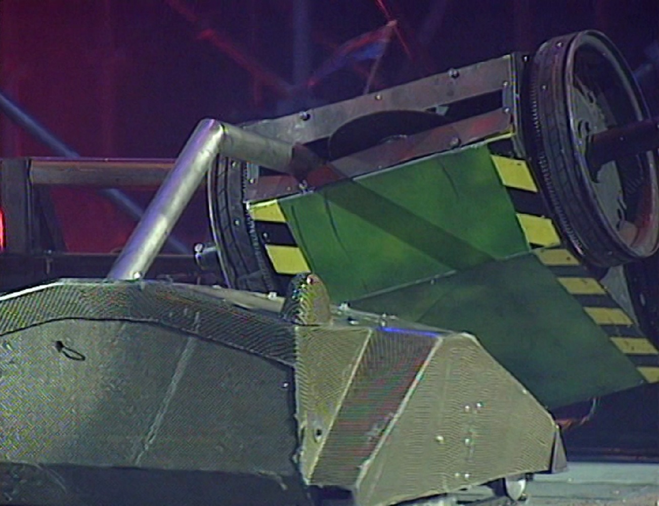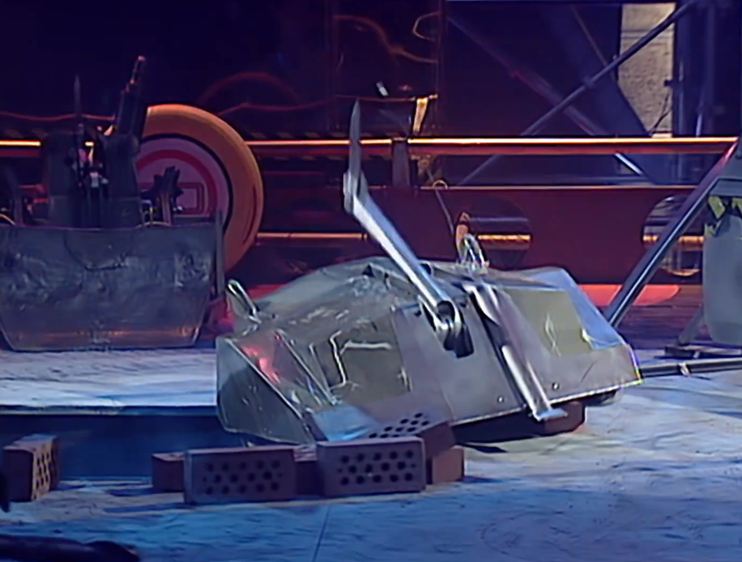 Mortis momentarily backed away, before pushing and axing Leighbot again simultaneously. It then retreated across the arena towards Matilda’s CPZ, turned, and pierced through Leighbot’s top armour again before backing fully into the CPZ. Mortis recovered to ram Leighbot again, this time getting underneath and turning it over into a Grille. With this, it emerged victorious, although Rob Knight admitted afterwards that he was surprised by the lack of power in the tantō weapon.