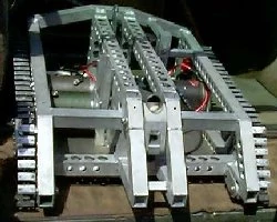 After having its tracks exposed in Series 1, Mortis was rebuilt and redesigned for Series 2, featuring a revised front end and newer, more angular armour which enclosed its tracks completely. The robot also received a faster and more reliable axe mechanism, a new transmission, and other general improvements; its colour scheme also changed from black and dark grey in Series 1, to all-over grey for Series 2. In both series, Mortis's drive and weapon systems used DC motors salvaged from mobility scooters, weighing 6kg each and driven by second-hand wheelchair controllers.[5] The axe for this version was forged by Arthur Chilcott over five days and then ground into shape over the following two. This version of the axe was made out of EN43B and tempered to a 65 Rockwell C hardness.[4]