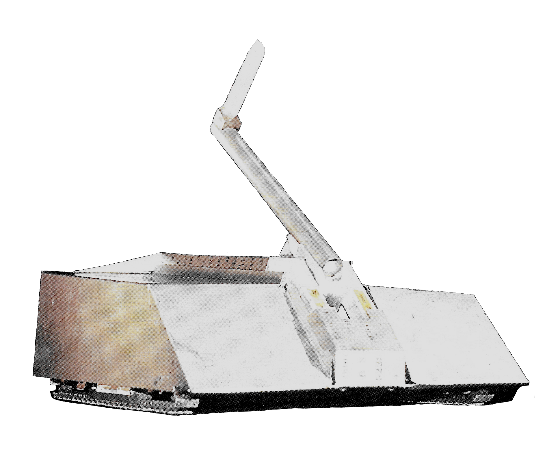 According to Rob Knight, a lifting arm was originally added next to the axe, hinged from a bracket positioned at the top-left rear corner. However, this broke on the Sunday preceding the studio dates, and was removed prior to filming, though the bracket was left in place.[6] Footage of Mortis with the lifting arm fitted was included in The Constructor's Guide, available as part of the original VHS release of Robot Wars: The First Great War.