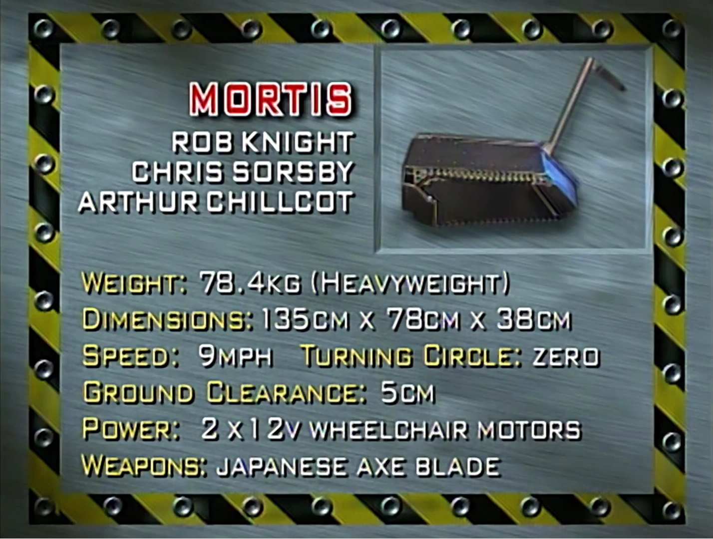 In its Semi-Final, Mortis faced Leighbot. During an interview shown on the Robot Wars: The First Great War, Rob Knight revealed to Philippa Forrester that one of the welds in its axe motor had cracked, resulting in Random Violence Technologies having to re-weld the motor before the battle. In the episode itself, however, only the below quote was aired, shown before the Mortis team's final with Recyclopse.