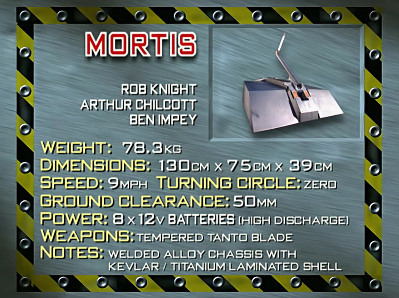- Mortis was one of four robots in Series 3 to compete in a trial event as well as the main competition. The others were Evil Weevil, Killerhurtz and Razer.