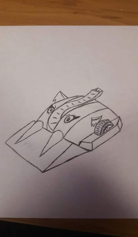 The drawings showed two potential front end and drivetrain set-ups; a two-wheel drive robot with a shallow wedge and a four-wheel drive robot with a broad angled wedge. In contrast to the completed BattleBots version, both had the wheels themselves exposed from the top.