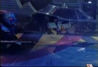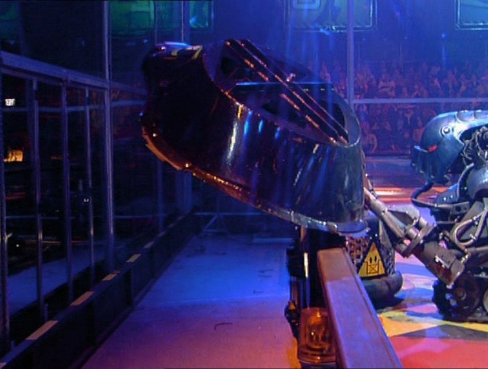 Night Stalker quickly got up to spinning speed, knocking Rosie the Riveter 2 away on the first impact. However, a later slam from Rosie the Riveter 2 disabled the spinner of Night Stalker, which was helplessly pushed it into the arena wall, and eventually the CPZ. Night Stalker was attacked by Matilda and Shunt, and became immobilized as a result of the axe blows and flywheel attacks. Night Stalker was pushed towards the Floor Flipper by Rosie the Riveter 2, then placed onto The Drop Zone by Shunt. Night Stalker revived its spinning weapon as a form of defence, but still took damage from a falling washing machine, and Matilda, before 'cease' was called.