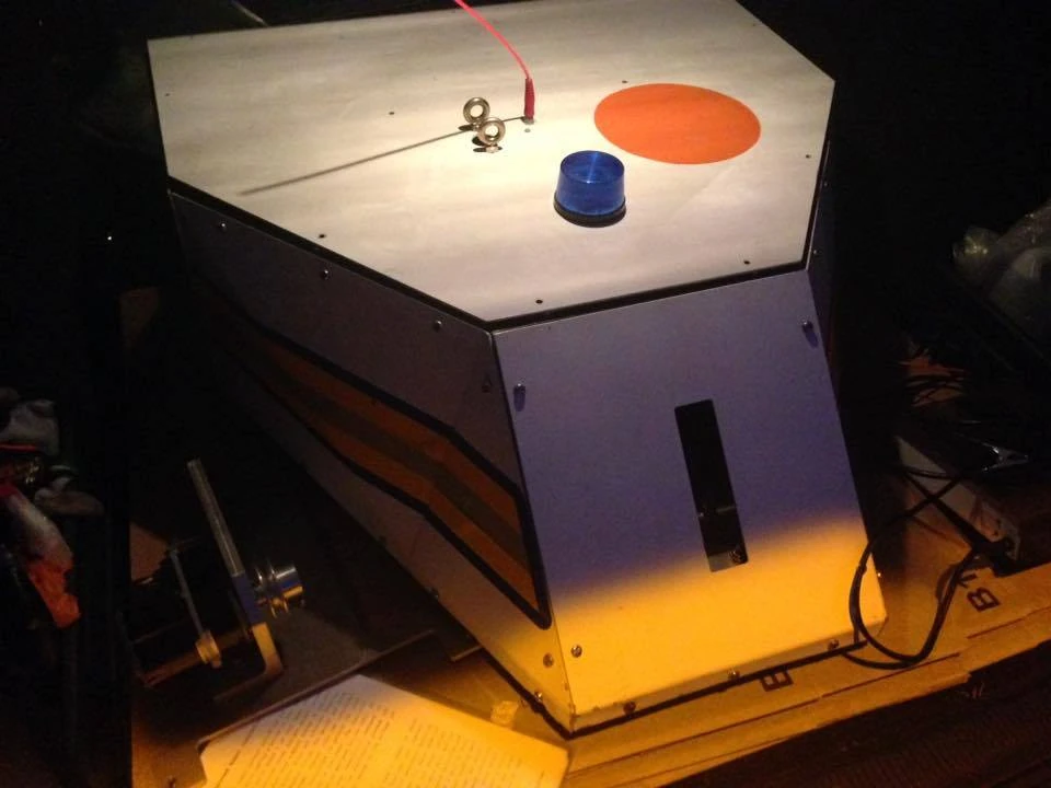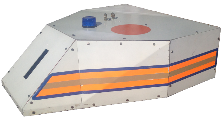 PC Plod was a white, wedge-shaped robot with orange, blue and yellow side stripes and a small blue light on top; its colour scheme resembled the 'jam sandwich' livery widely used by British police cars around the time of Series 4's production. It was armed with a small saw blade built into the front wedge for weaponry. PC Plod's armour was strong, but the robot was light at 65kg, and its cutting disc could only reach out of the robot's armour by a few millimetres at maximum. The robot was powered by 2x 12V 12ah lead acid batteries.