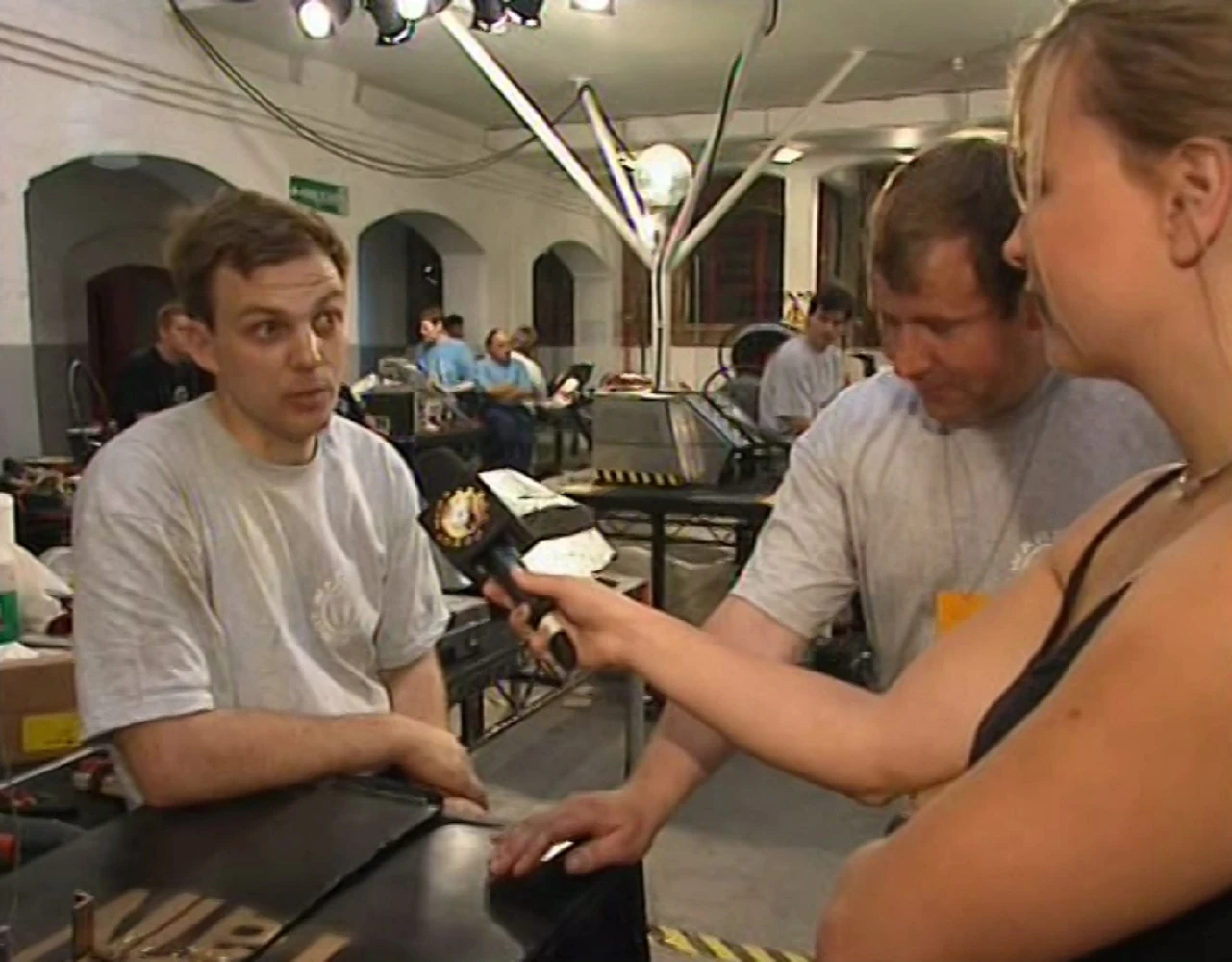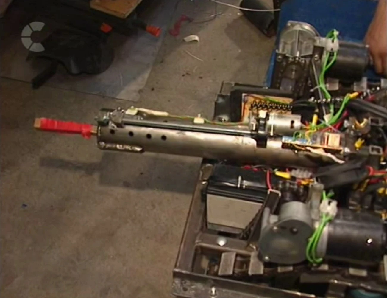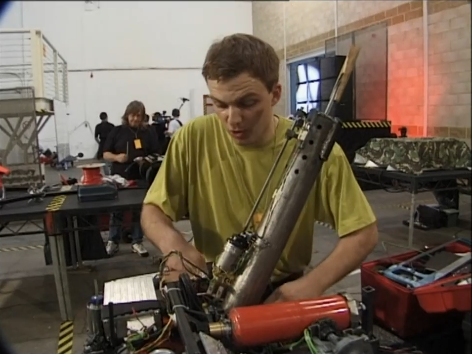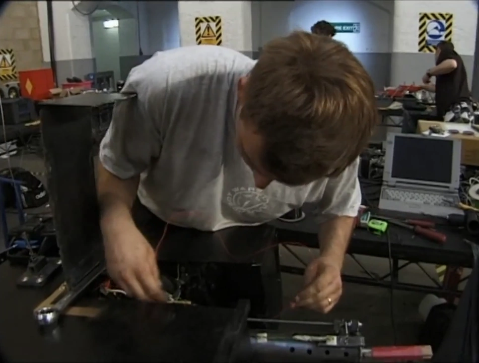 - "...we've had a complete nightmare. All our electronics died, so we bodged up something so that we could at least drive around, and put them in a really stupid place. So now, we've got to get the case on before we start the motor, and the bit of string's not long enough, so we're getting another bit of string. If we get a little bit of a delay, we can at least get the cutting disc going and we can give the House Robots something to chew on."
