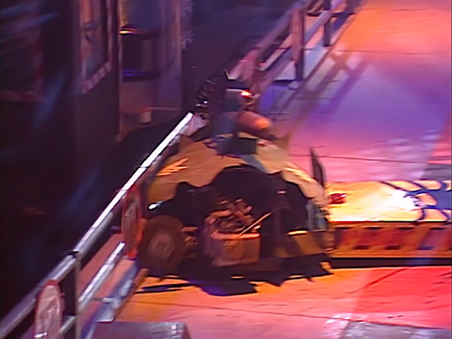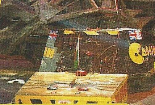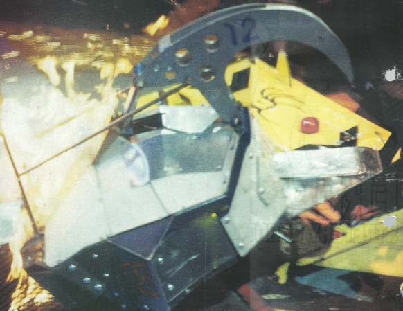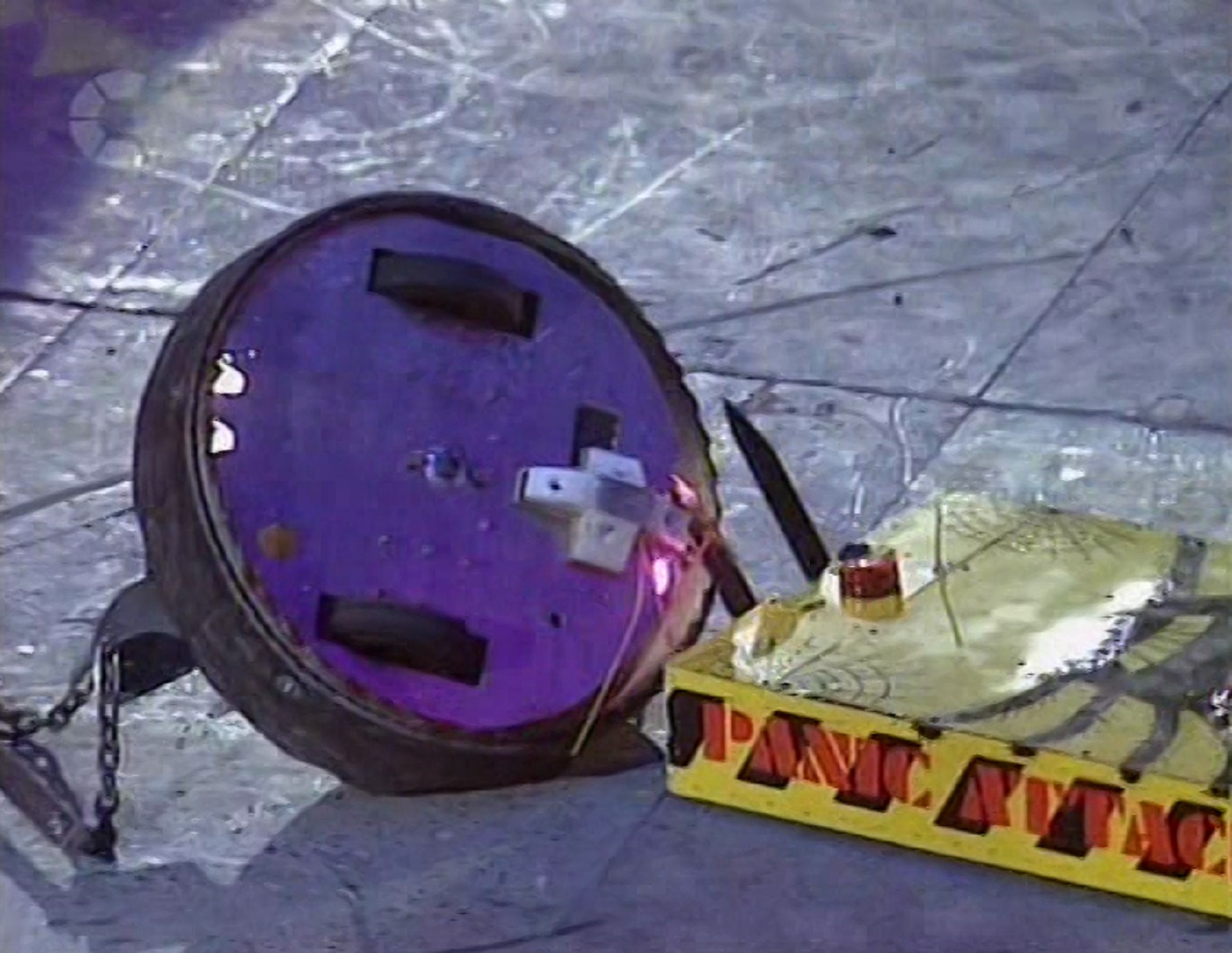 This version had no self-righting mechanism because it would have pushed the robot over the weight limit[13]. Despite this, this version's weakness was listed as "Slow Self-Righting".[14]. The batteries were 2 Hawker Energy SBS 15, and it had 3 4QD NCC-70-24 speed controllers, 2 used for drive and 1 used for the weapon[15]. Although it had good pushing power, it was not as easy to control as the previous version, was slower and lighter, and generally less powerful overall, with the lack of a srimech also proving costly. Kim Davies stated his dissatisfaction with this version of Panic Attack after its loss.