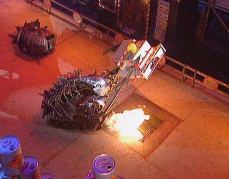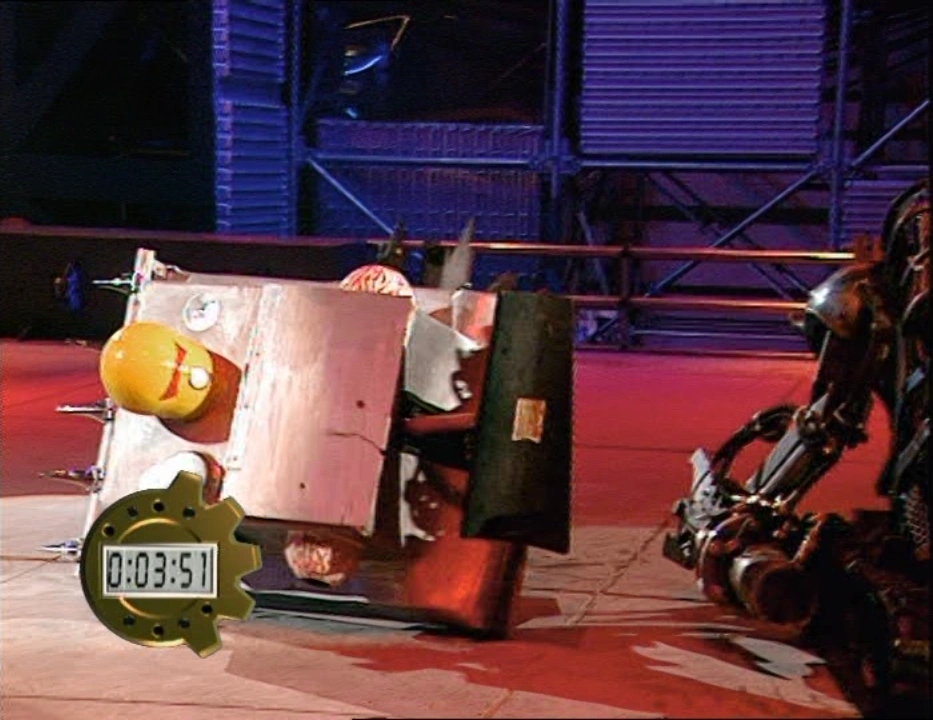 Piece de Resistance moved sluggishly forward at the beginning of its Trial and despite the claim of its power being increased for this run, it was unable to make any impact on the skittles. It was attacked by Matilda and flipped on its side, leaving it with a score of zero, which cost it the place in the tournament.
